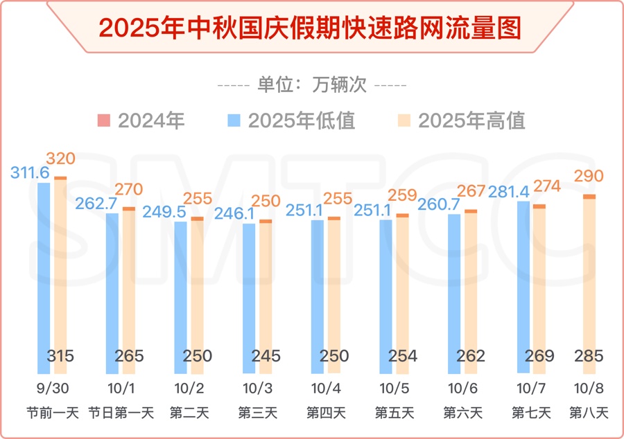 这份出行指南信息显示,中秋国庆假期,上海高速公路日均流量将达161万辆次至166万辆次,同比增长在3%以内。备受关注的G40沪陕高速长江隧道,日均流量达11.6万辆次/日,同比增长约5%。其中上行(江苏方向)5.4万辆次,下行(市区方向)6.2万辆次。