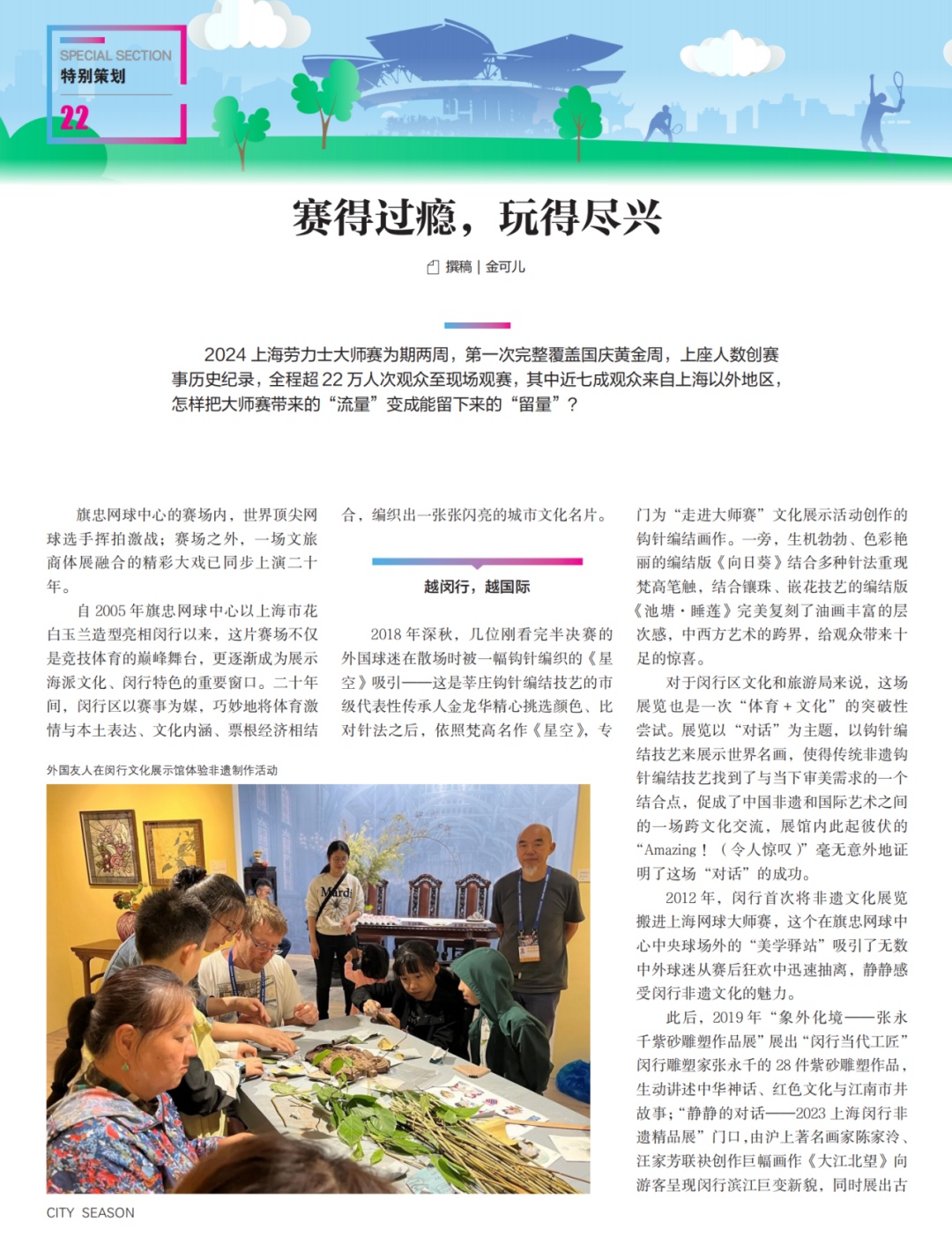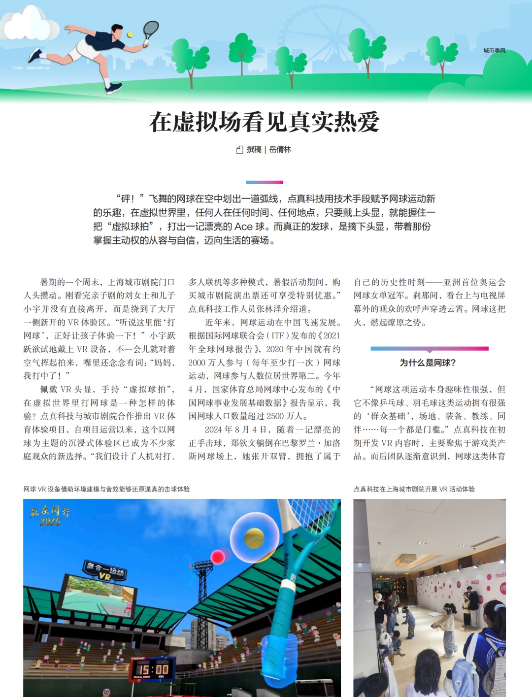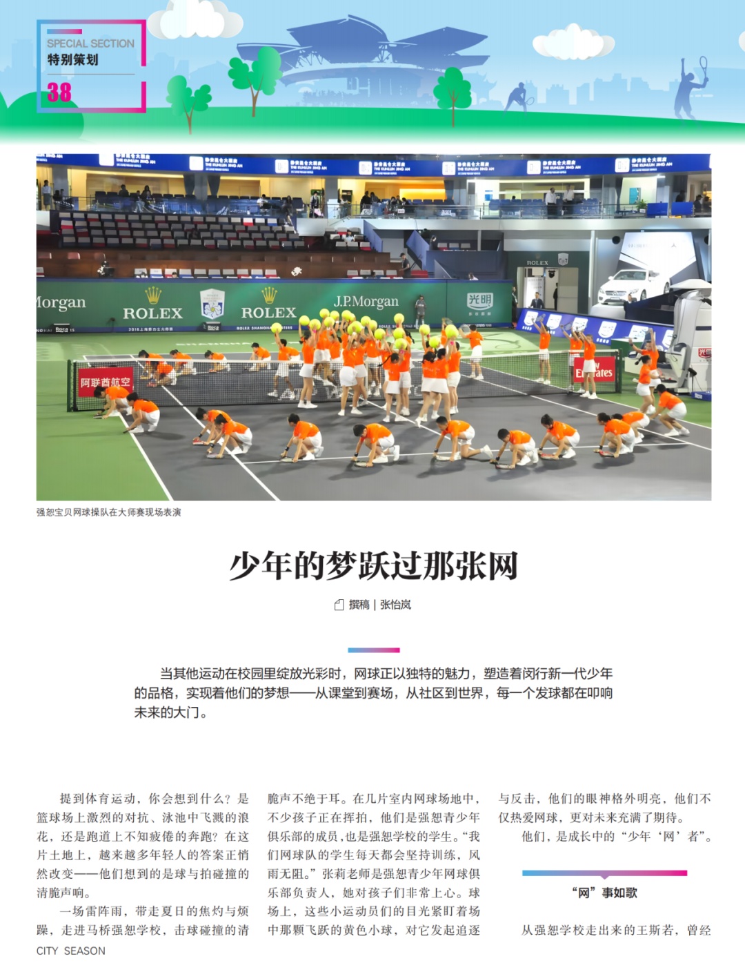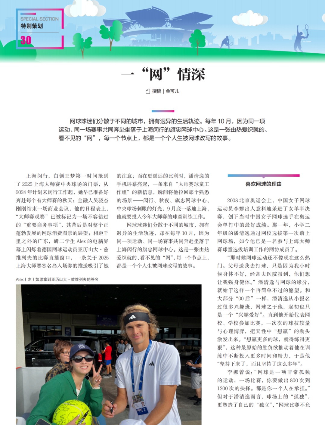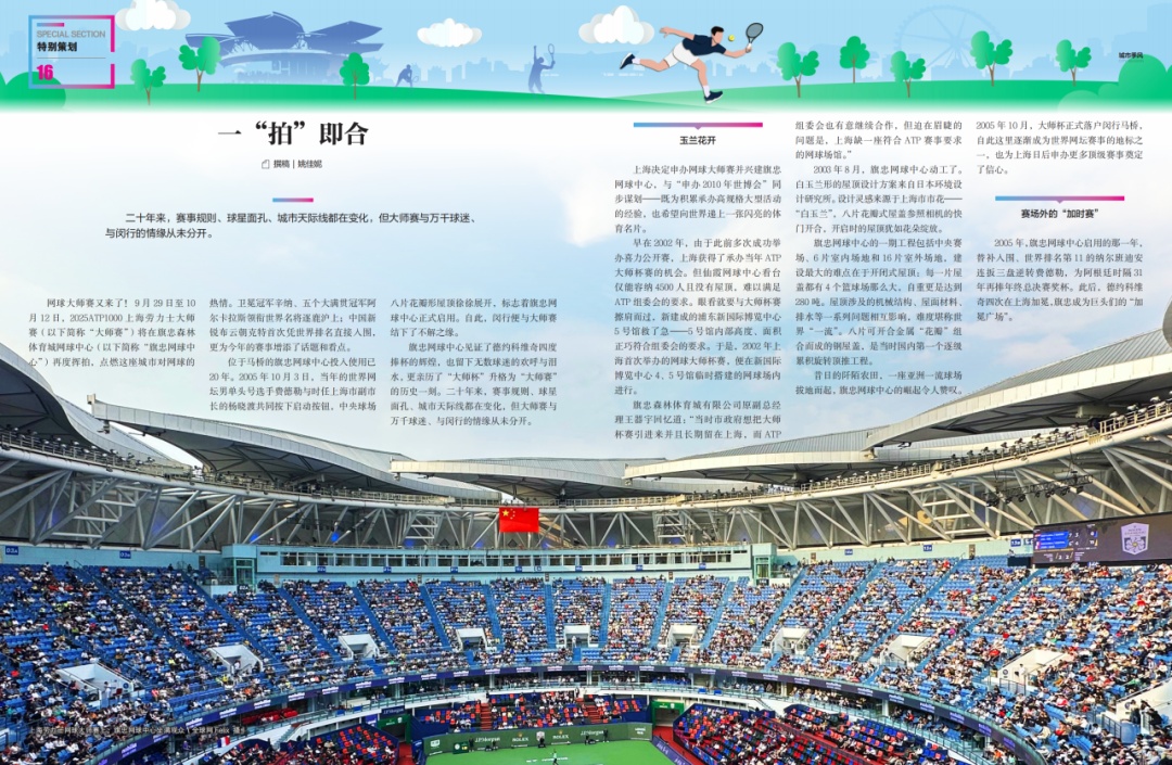 01 《一“拍”即合》 作者:姚佳妮 二十年来 赛事规则、球星面孔 城市天际线都在变化 但大师赛与万千球迷 与闵行的情缘从未分开 02 《赛得过瘾,玩得尽兴》 作者:金可儿 2024年上海劳力士大师赛为期两周 上座人数创赛事历史纪录 全程超22万人次观众至现场观赛 近年来 闵行怎样把大师赛带来的“流量” 变成能留下来的“留量”? 03 《一“网”情深》 作者:金可儿 每年10月 全球球迷因为同一项运动、同一场赛事 共同奔赴坐落于上海闵行的旗忠网球中心 这是一张由热爱织就的、看不见的“网” 每一个节点上 都是一个个人生被网球改写的故事 04 《少年的梦跃过那张网》 作者:张怡岚 当其他运动在校园里绽放光彩时 网球正以独特的魅力 塑造着闵行新一代少年的品格 实现着他们的梦想 从课堂到赛场,从社区到世界 每一个发球都在叩响未来的大门 05 《在虚拟场看见真实热爱》 作者:岳倩林 在虚拟世界里 任何人在任何时间、任何地点 只要戴上头显 就能打出一记漂亮的Ace球 而真正的发球,是摘下头显 带着那份掌握主动权的从容与自信 迈向生活的赛场 “ 还有更多精彩内容 在这里等你 ↓↓↓↓↓ ”