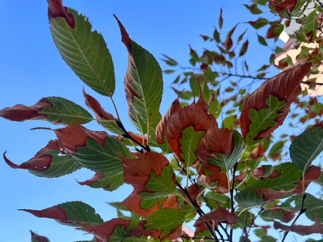 小区门口的一颗树,一半翠绿一半枯黄。枯黄的叶边像是燃烧的火焰,要终结掉绿叶的使命。