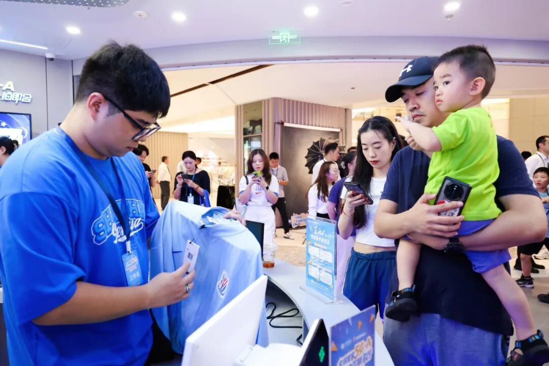 走进展厅,鲜明的“申花蓝”装点了整体空间,令人眼前一亮。据介绍,该联名厅结合了5G-A互动科技,是一个集打卡、体验、社交与消费于一体的“可看、可玩、可感”超级新空间。
