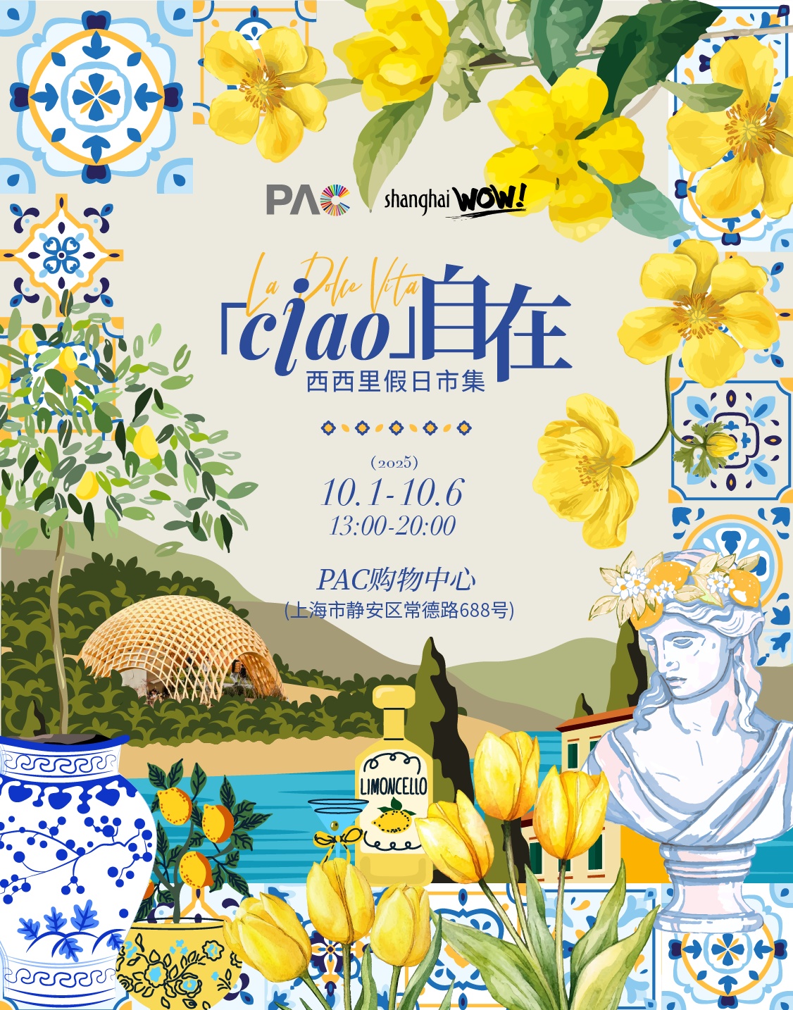10月1日-10月6日13:00-20:00,PAC携手Shanghai WOW,共同呈现“ciao自在 · 西西里假日市集”,打造一场沉浸式地中海微度假体验。市集区域设置15-20个精选摊位,涵盖意大利手工艺品、西西里特产食品(如柑橘冰淇淋、橄榄油、葡萄酒、甜品)、度假风服饰配饰等呈现原汁原味的地中海生活方式。