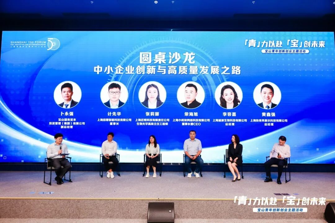 圆桌对话环节由上海宝山国有资本投资管理(集团)有限公司副总经理卜永强主持,邀请了五位创新创业青年代表——上海倍增智能科技有限公司董事长计先华、上海近观科技有限责任公司生物光学高级主任工程师张莉丽、上海小砖块网络科技有限公司董事长兼首席执行官荣海旭、上海迪派生物科技有限公司总经理李容嘉、上海快来秀展示科技有限公司总经理黄鑫强,围绕“中小企业创新与高质量发展之路”展开了深入讨论,嘉宾们通过分享自身创业过程中的困难、挑战与突破,为青年创业者们提供了思路和启迪。