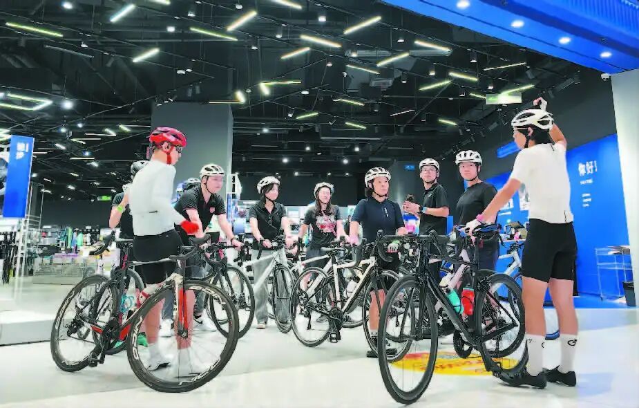 不少运动品牌正形成共识,与商场共同打造“玩得好”的运动氛围。图为骑行队员在迪卡侬上海荟聚店。(受访者供图)