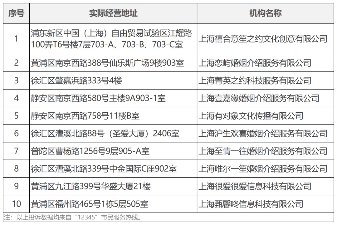 为进一步规范婚介行业诚信经营,提升婚介机构服务质量,市婚姻介绍机构管理协会现公布本市2025年8月及1-8月实体门店投诉量前十的婚介机构名单,具体名单如下:
