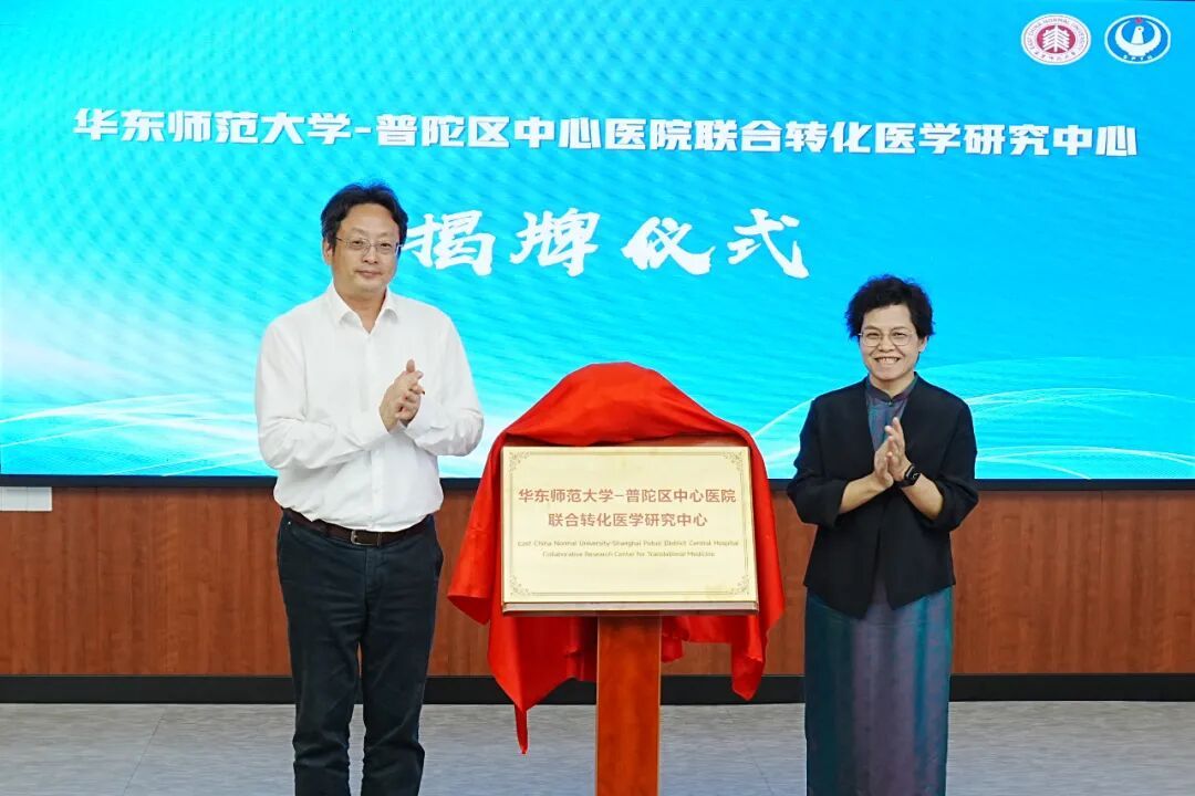 普陀区副区长王珏与华东师范大学党委常委、副校长施国跃共同为“华陀中心”揭牌,标志着该中心正式成立并投入运行。