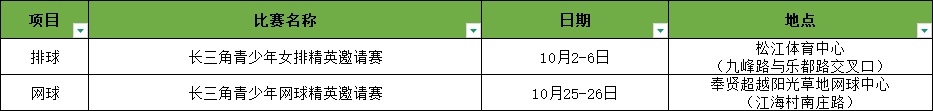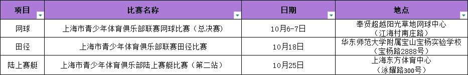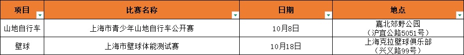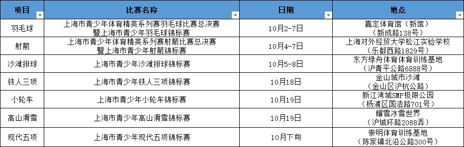 上海市青少年体育比赛持续进行中十月将举行13个项目14个比赛其中可授予运动员技术等级比赛涉及7个项目7个比赛其他项目比赛涉及2个项目2个比赛长三角精英邀请赛涉及2个项目2个比赛俱乐部联赛涉及3个项目3个比赛一起来看看!可授予运动员技术等级比赛点击查看大图其他项目比赛点击查看大图长三角精英邀请赛点击查看大图俱乐部联赛点击查看大图●●●
