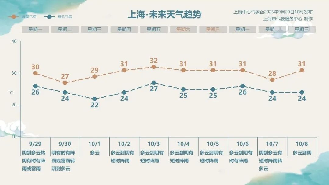 今日(9月29日)上午申城以多云到阴为主,下午起雨水再度显现,今天夜间到明天白天雨势变大,并伴有雷电,预计局部地区的累积雨量可达大雨到暴雨。全天气温在25~30℃。