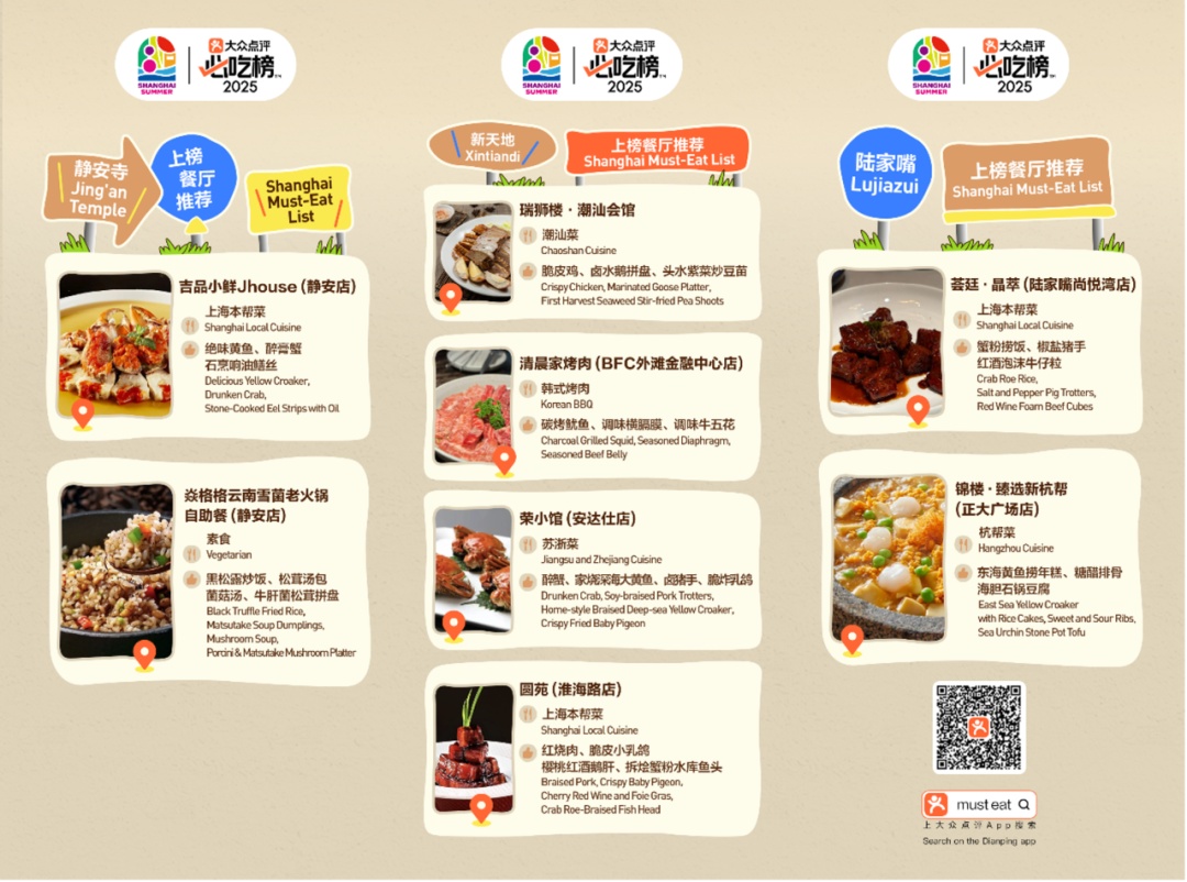 线下在上海陆家嘴、南京东路、静安寺、新天地等多个热门商圈的必吃榜上榜餐厅同步投放“上海之夏”必吃榜领吃计划美食路书,发放中英韩三语海报及宣传手册页,为海内外游客提供“发现魔都美食好去处”的打卡指南。