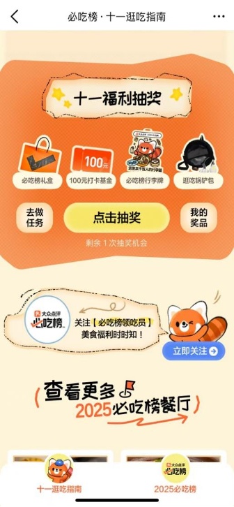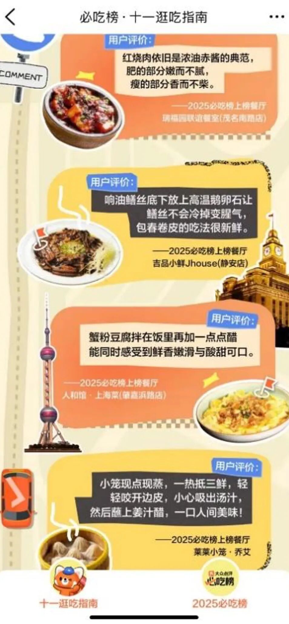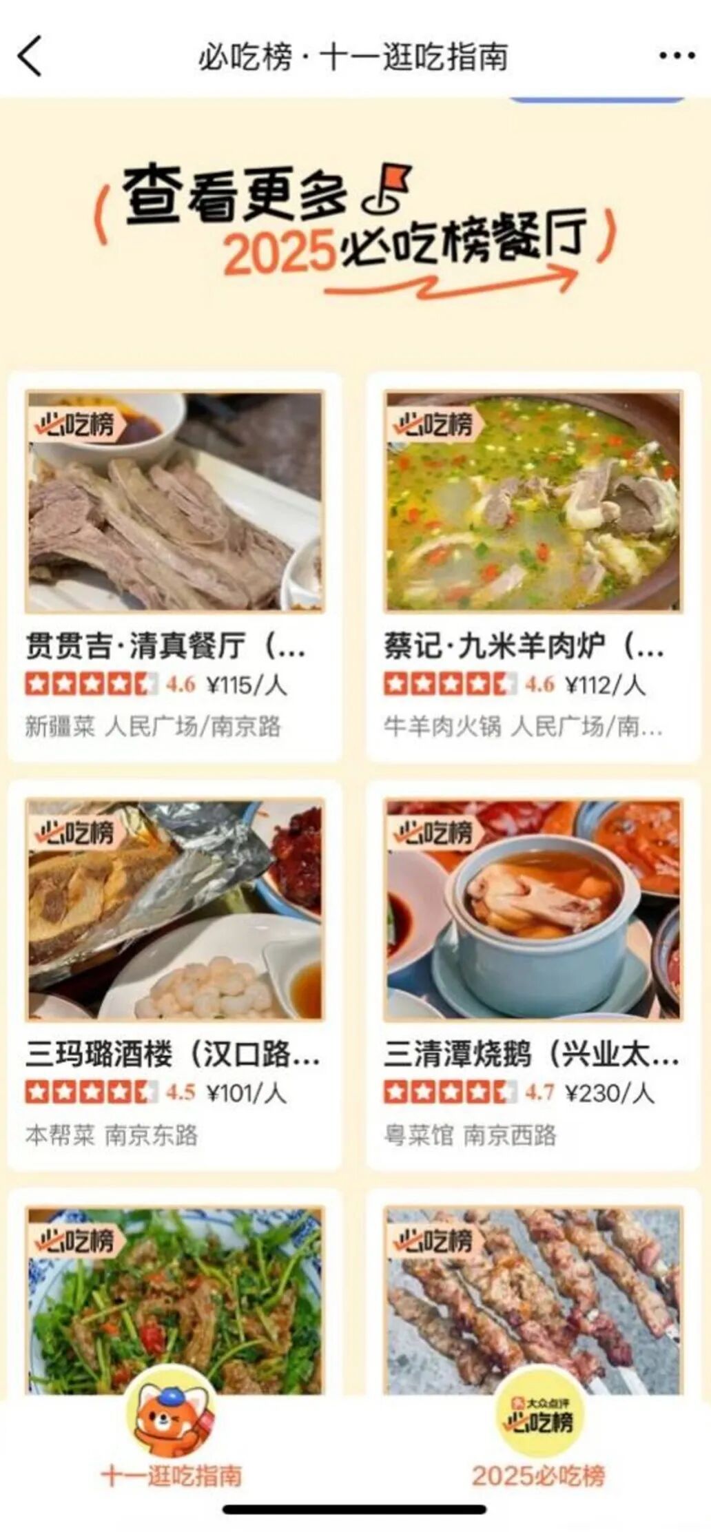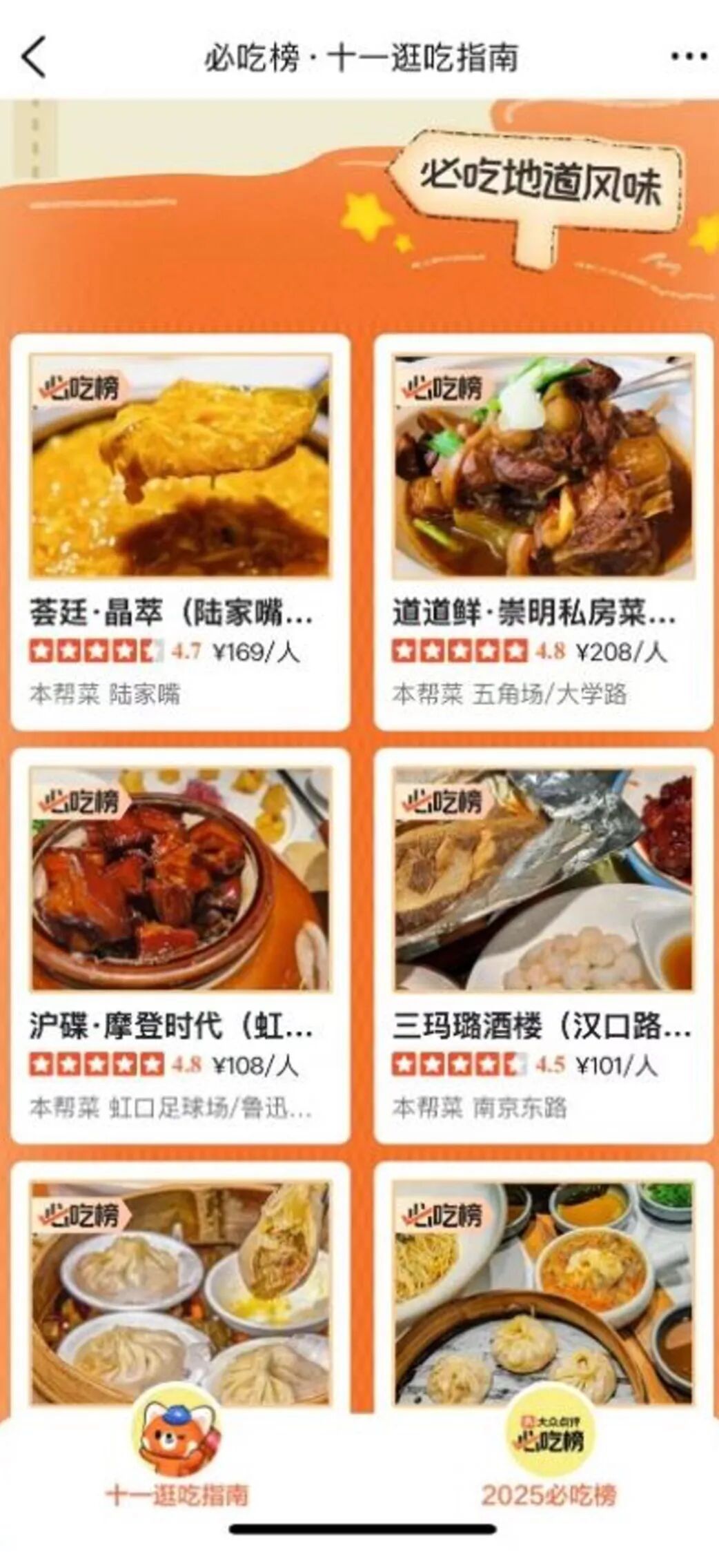 市民游客打开大众点评 APP,在首页搜索 “必吃榜国庆”,即可直达活动页面。一键 get 上海必吃美食清单,马上开启你的十一逛吃计划!完成页面指定任务即可获得100元打卡基金、逛吃包、行李牌等超多必吃榜限定周边福利奖品等你来拿,轻松开启探索魔都美食之旅。