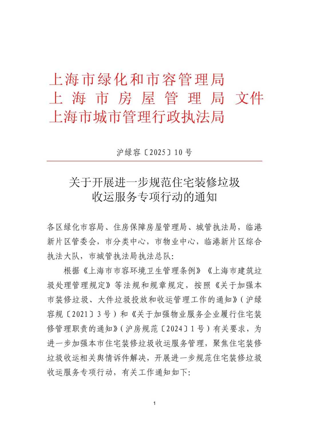 上海市绿化和市容管理局认真践行人民城市重要理念,深化党建引领基层治理,将“规范装修垃圾收运管理”纳入2025年绿化市容行业十项民生实事项目之一,联合房屋管理、城管执法等部门综合施策、同题共答。开展实地调研、广泛征求意见,开展“规范住宅装修垃圾收运服务专项行动”,督促指导各区落实属地责任,发挥行业自律作用,努力办好装修垃圾收运民生实事。