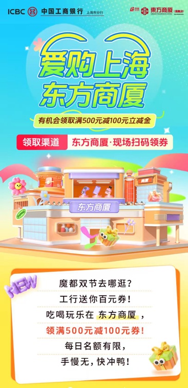 活动期间,工商银行上海地区信用卡持卡人在上海地区指定活动页面有机会领取1张满500元减100元微信立减金(每笔订单最高优惠100元),本人通过微信绑定上海地区工银信用卡在东方商厦指定商户处使用支付(斯比特花园、惠食佳、施舒雅、DZsa-lon、埃柯思工作室、聚达美妆、Skin Perfection、ALINECOOL不参与活动)。活动期间,每人限参与1次。每个活动日限额50张,总量限额650张,先到先得,当单个活动日的立减金份额达到上限,当日活动将提前结束。