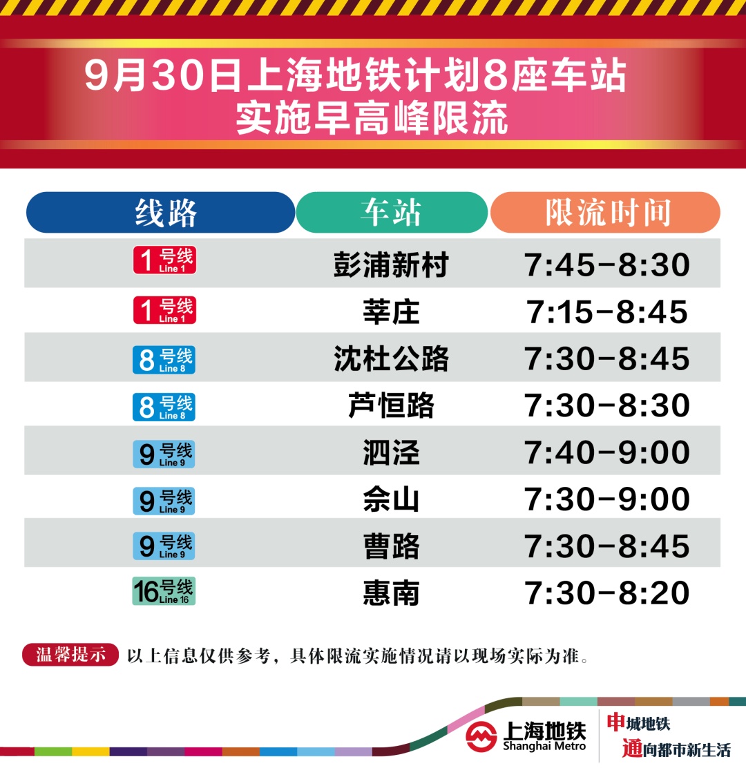 9月30日,上海地铁早高峰限流措施将继续实施,届时将有8座地铁站早高峰计划限流。