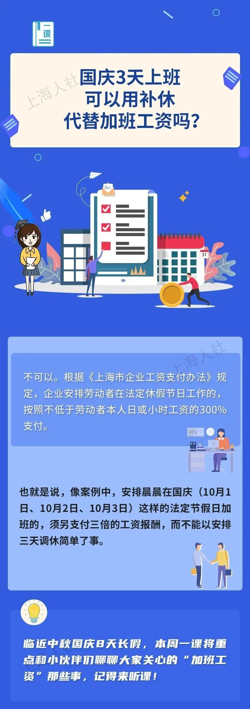 晨晨是一家连锁品牌服饰的导购员。上周由于要举办促销活动,通知她10月1日-10月3日加班。同时主管告知晨晨,10月9日-10月11日将安排她调休3天,就当作加班工资了。晨晨有点郁闷了,这国庆3天都上班,随随便便就可以用补休代替加班工资了吗?