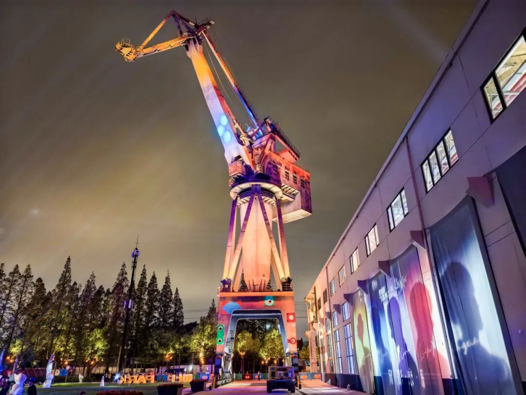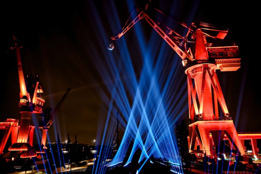 现场,复兴岛的百年塔吊化身巨幕,上海首发3D Mapping大秀《百年光潮》带领大家穿越时空,感受工业文明与数字未来的碰撞。黄浦江的潮声成为背景音,光影与技术共舞,设计师将1973年建造的120吨塔吊转化为一个巨大的动态艺术装置,以黄浦江“不变的江潮”为意象,串联起杨浦区从工业时代到科技未来的辉煌历程,展现城市变迁中的“变与不变”,传递开放、时尚、创新、包容的城市精神。