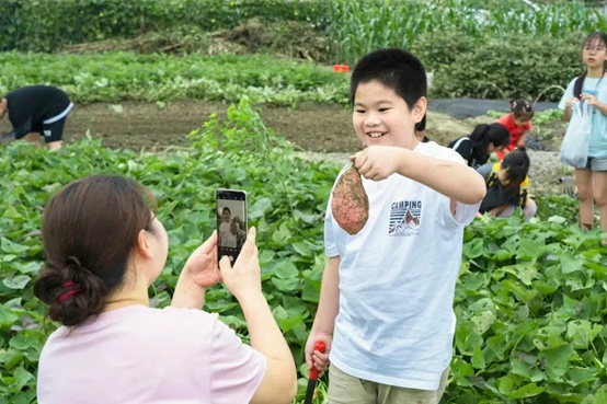 在“乐田小农场”,图文并茂的科普展览详细介绍了水稻、红薯、玉米、大豆等作物的来历与特性,以及套种、轮作等增产科学知识。田垄间,家长和孩子一起蹲下身辨认作物,手持小铲小锄细心劳作。每当翻出大个红薯,田里便响起阵阵惊喜的欢呼;金黄的玉米、翠绿的豆角也陆续装满每个家庭的采摘袋,丰收的喜悦洋溢在每个人脸上。家长陆女士表示:“孩子第一次知道每天吃的米饭是这样种出来的,特别兴奋!亲手挖红薯,比看书本印象深多了,这样的科普既长知识又有温度。”