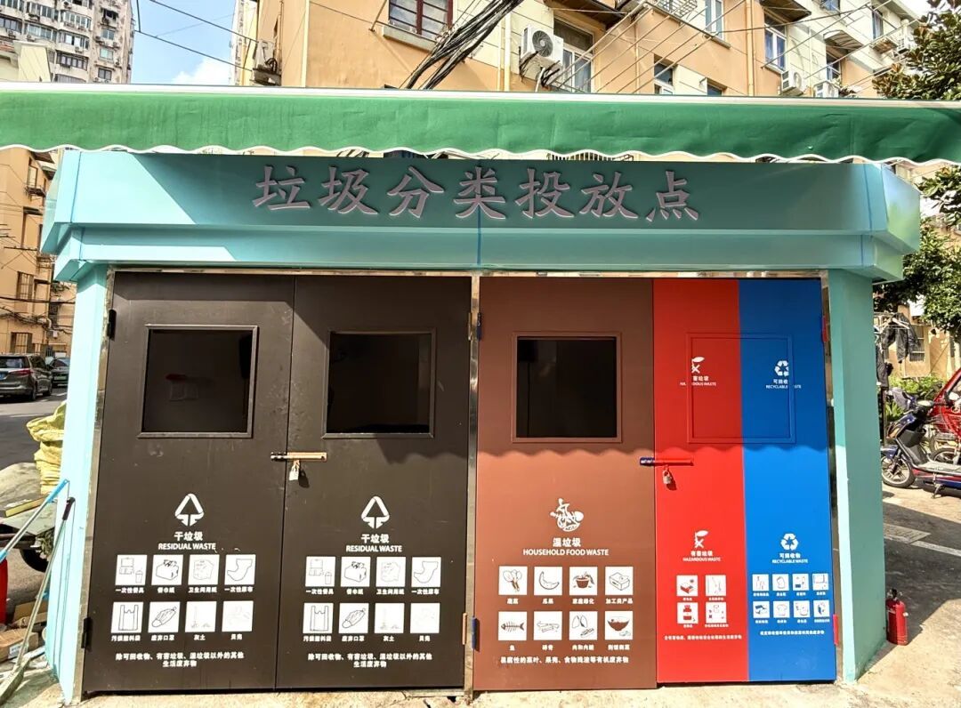 大连西路201弄甲23号垃圾投放点位改造前一直以露天形式存在,面积小摆桶数量有限,生活垃圾时常满溢,改造成垃圾房后存桶量增加,合理化调整四分类投放口位置,优化了居民投放区与存桶清洗工作区,安装全新环保照明和灭蚊设施,配备排风扇和防水插座,投放环境极大改善。