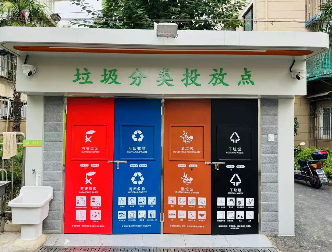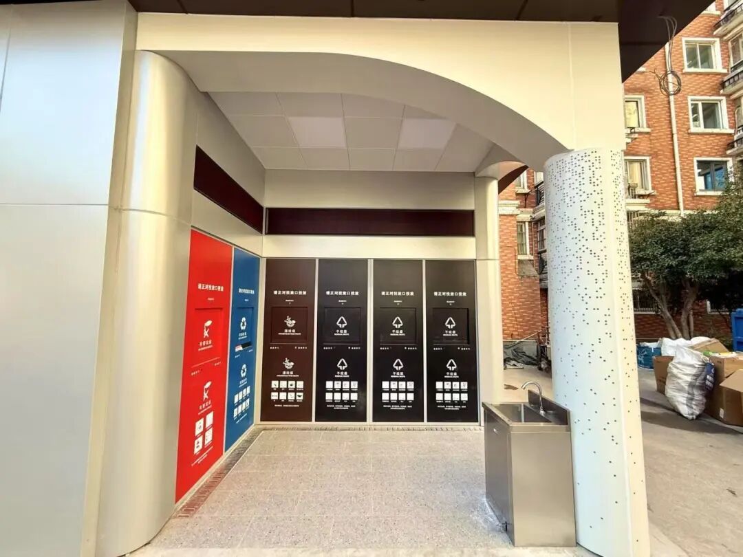 垃圾房门窗均采用耐腐蚀、锈蚀环保材质,内部重新划分各类功能区,分为存桶区、工具区、清洗区、投放区四大区域,设置固定拖布池、排水槽,并连通污水管网,方便日常清理。同时,内部还配置了节能灯具、防水插座以及除臭、杀虫、通风装置,有效防止异味飘散和蚊蝇滋生。