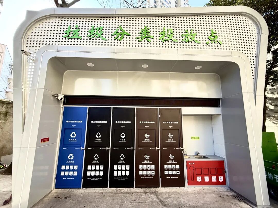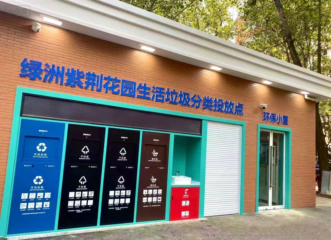 紫荆花园惠民回收服务点设有精细化回收分类容器,包括玻璃、金属、塑料、纸张、织物五大品类,并增设分类宣传文化墙、环保标语牌和“一米花园”等创意宣传载体,打造低碳环保宣传阵地。改造后存桶量增加一倍,后续清运模式转变,通过加装“自动升降换桶”设备存桶量从40桶增至80桶,调用“后压式清运车”实现日产日清。
