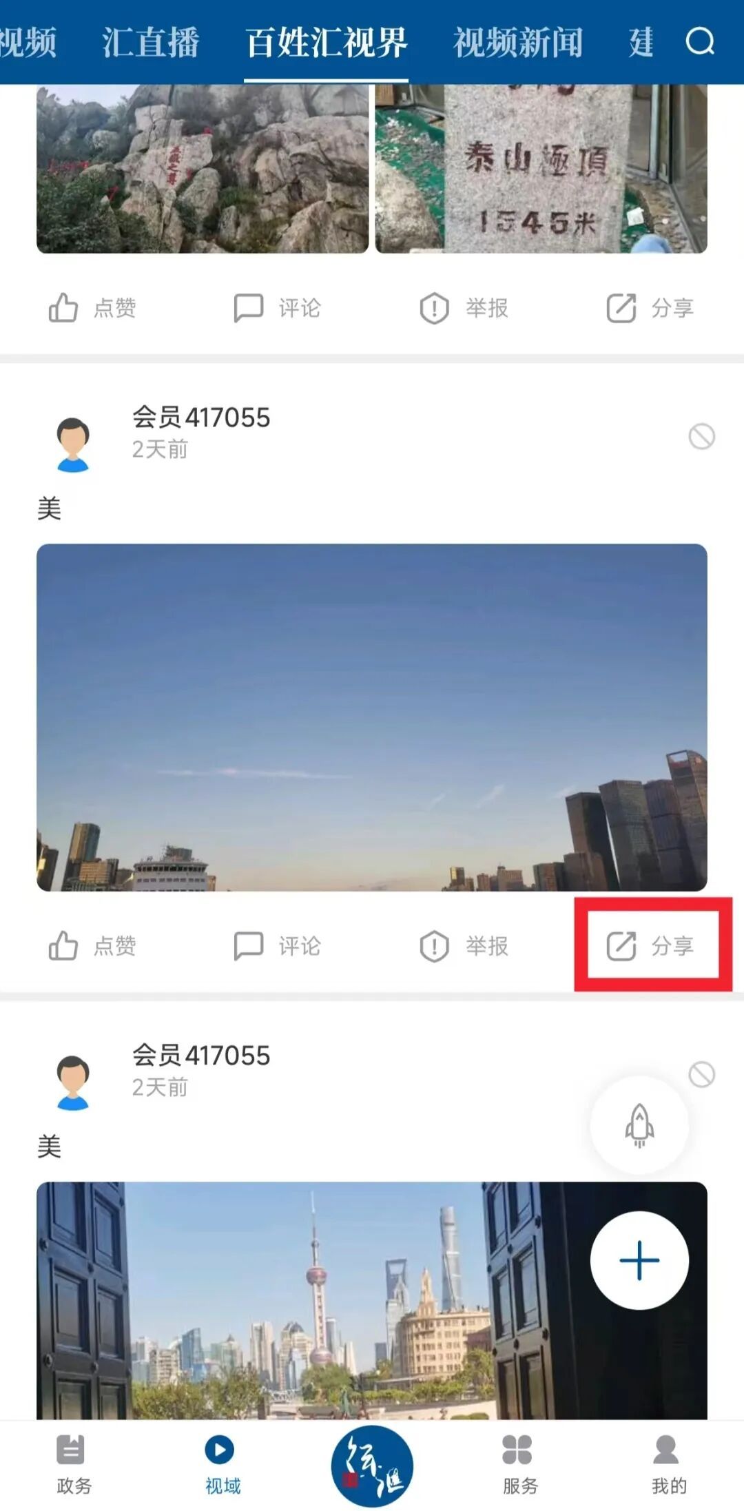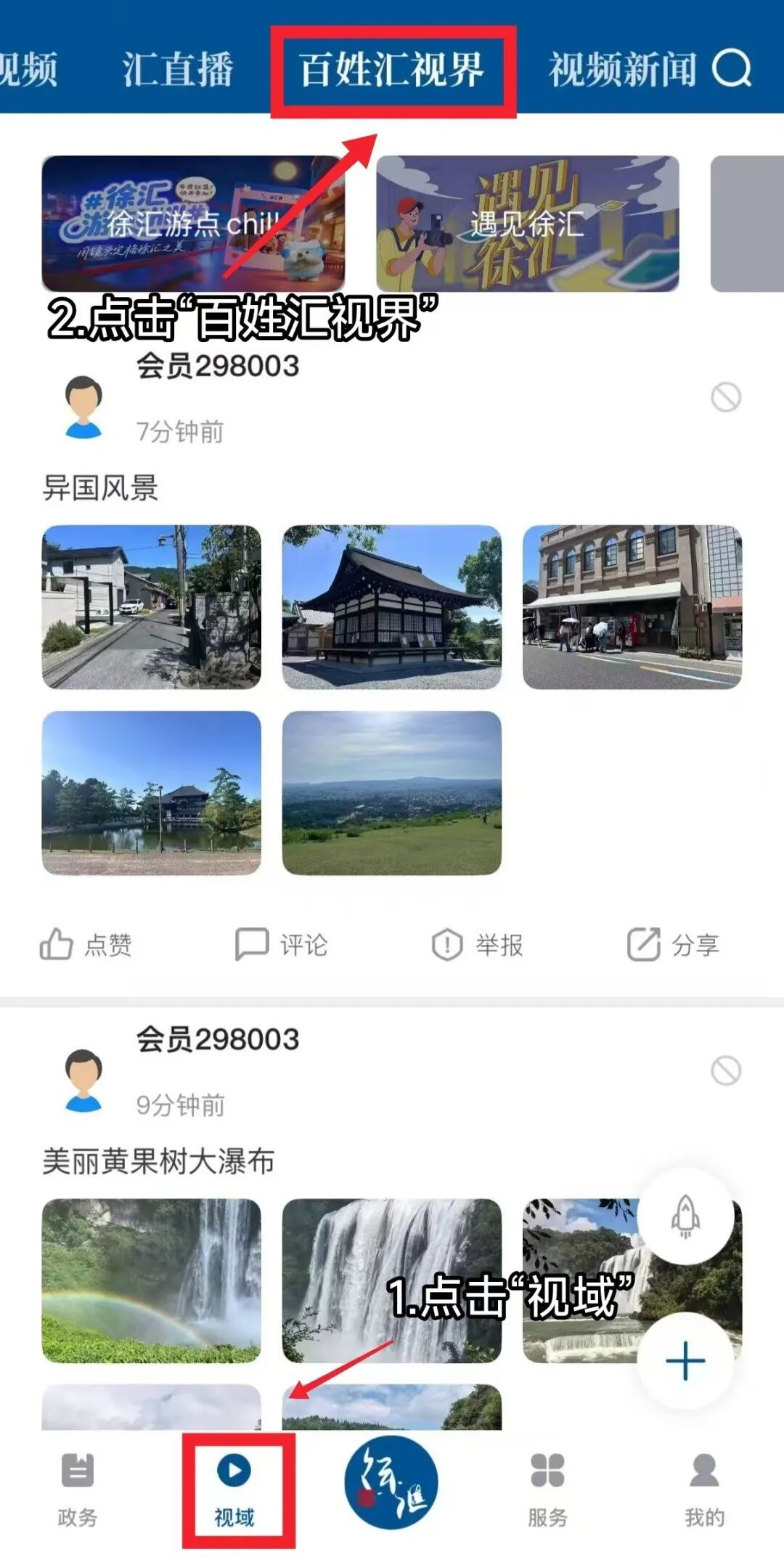 1.用户注册/登录“徐汇通”App并通过“视域”页面进入“百姓汇视界”。