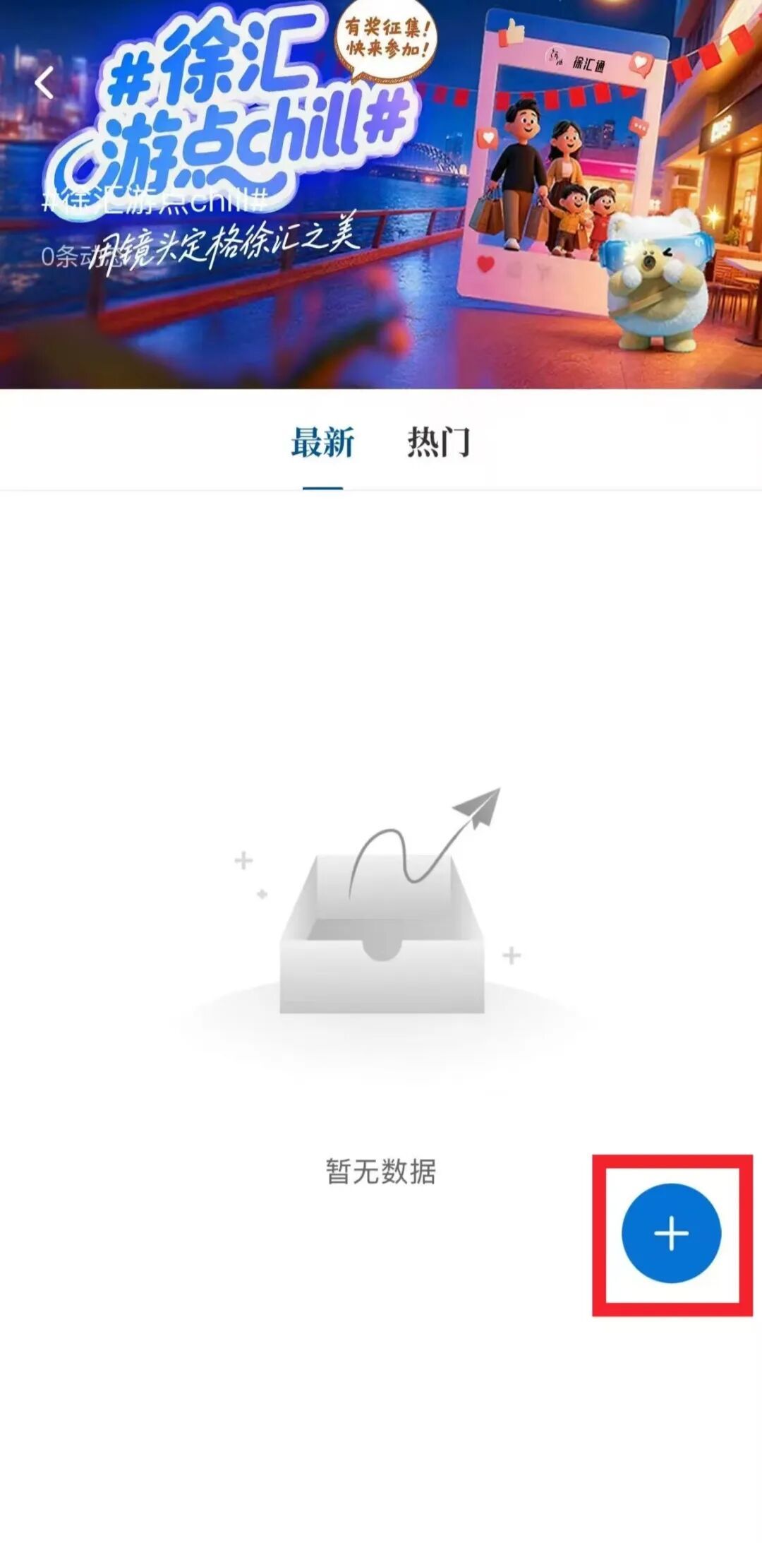 2.选择“徐汇游点chill”话题页面,点击“+”号,按照格式:#徐汇游点chill#+摄影作品+作品拍摄地点,上传随手拍摄的相关作品并进行发布提交。