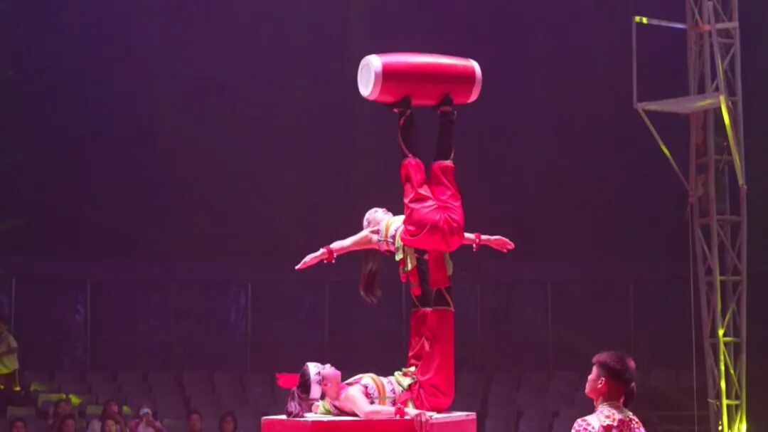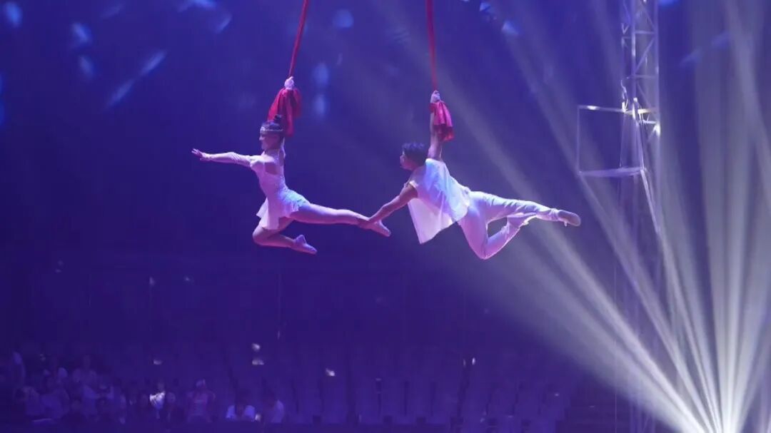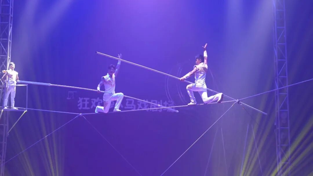 随着音乐响起,马戏表演拉开帷幕。只见灵活矫健的杂技演员在舞台上展现着高难度动作,时而在空中舒展身姿,时而在道具上完成精准配合,每一个动作都引得台下观众阵阵惊呼。节目《大禹》融入中国神话故事,以杂技为表现手段,辅以音乐、舞蹈等形式,带给观众仿佛置身于远古时代的体验感。幽默风趣的小丑一登场,全场的欢乐氛围瞬间被点燃,小朋友们更是兴奋地站了起来,挥舞手臂想得到小丑派送的礼物。
