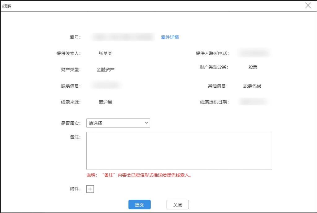 承办法官完成线索调查核实工作后,可以进入详情列表页面,点击右侧【办理】按钮进入办理页面,填写【是否属实】和【备注】两项内容,【备注】填写内容将以短信形式推送给线索提供人。