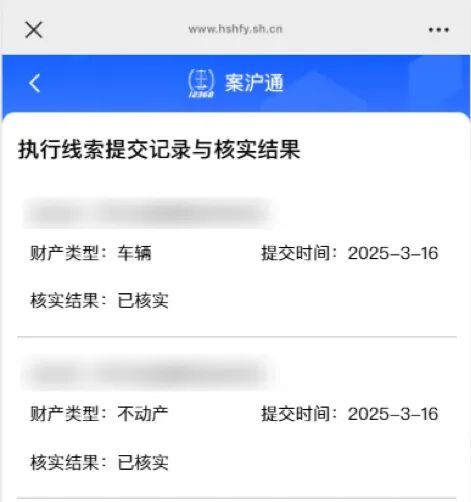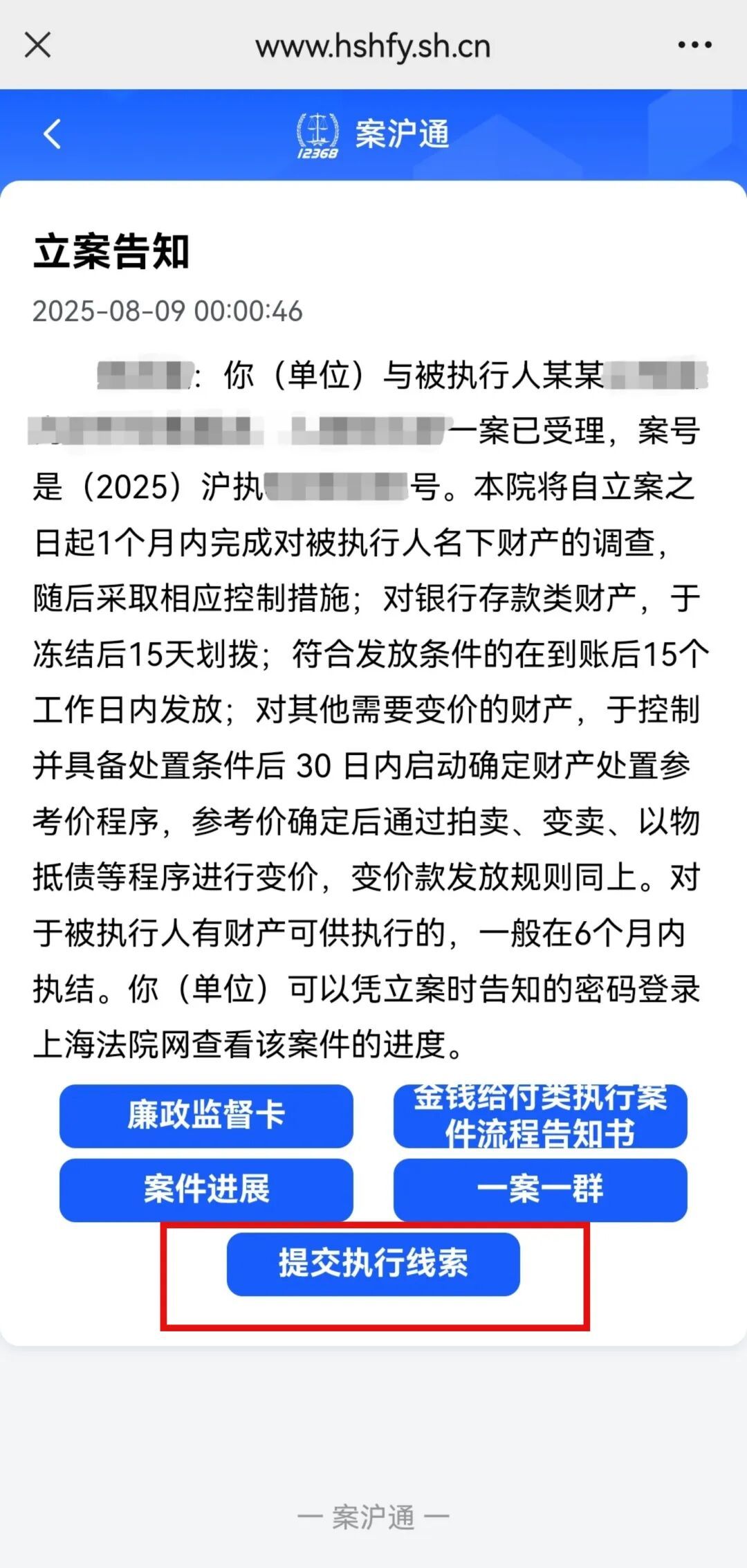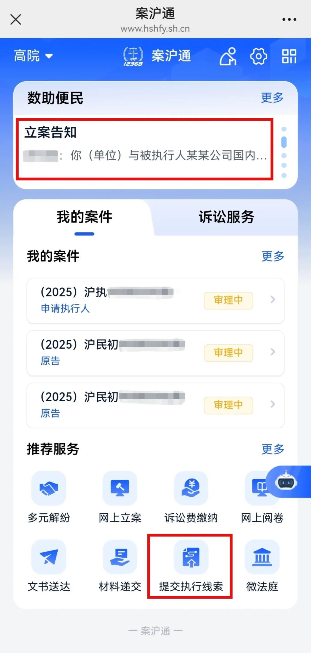 法官完成核实操作后,线索提交人可以在“案沪通”首页【数助便民】板块中查看线索核实结果。此外,申请执行人、被执行人还可以通过【我的案件】查看核实情况。