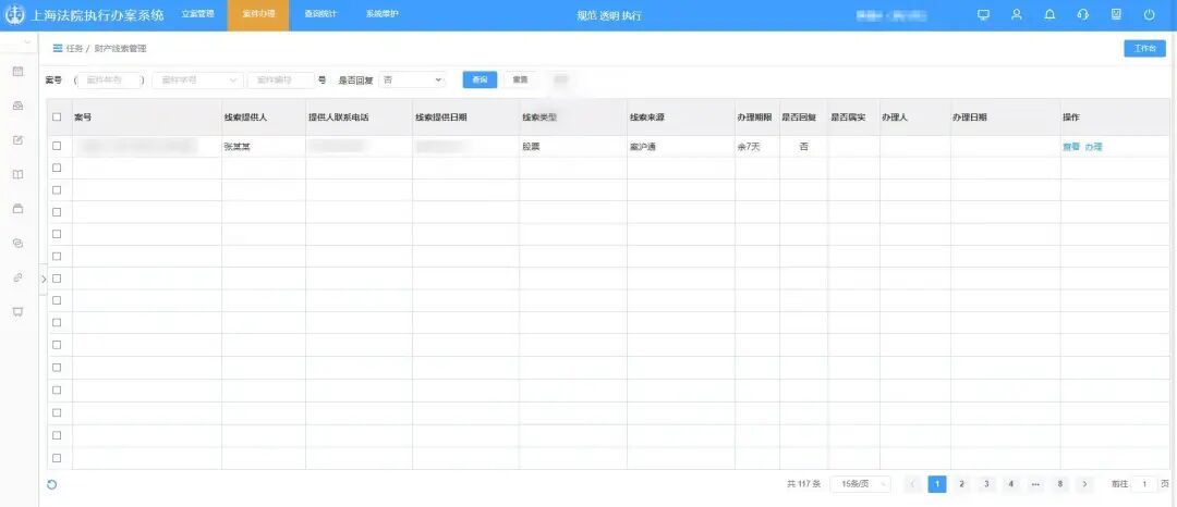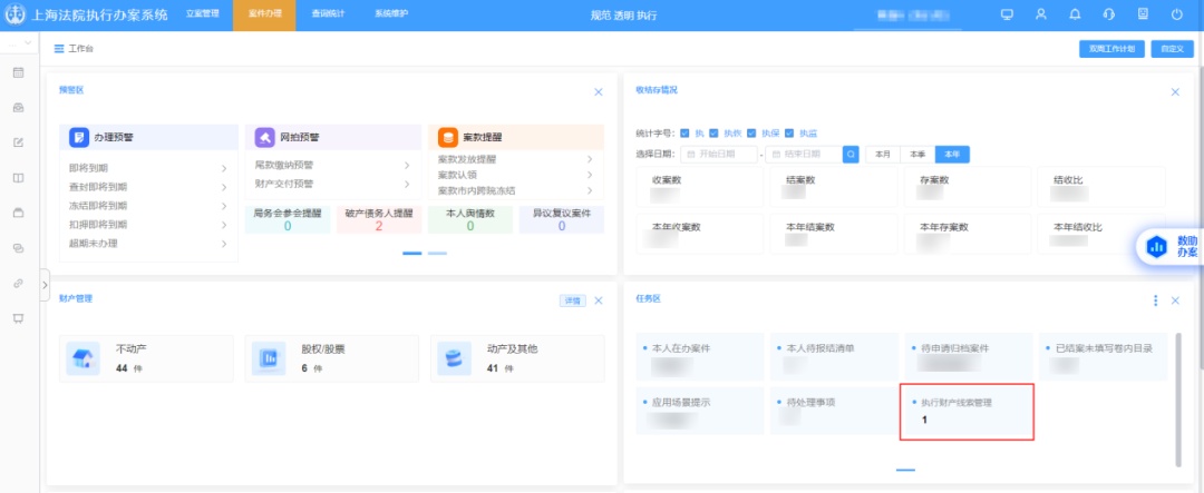法官使用的执行办案系统中,【工作台】页面【任务区】一栏会增加【执行财产线索管理】入口,并展示待确认财产线索数。通过点击数字可以访问详情列表页面,从而查看执行财产线索的具体内容。
