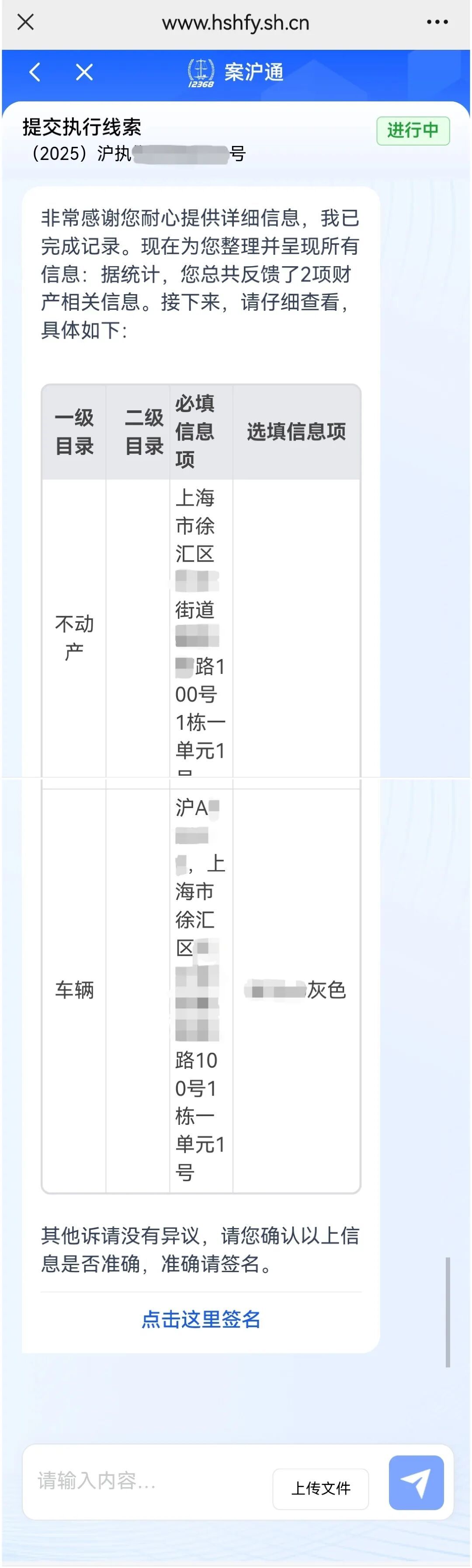 对话完毕后,【案沪通AI法宝】会根据对话内容自动总结归纳财产线索并形成表格,线索提交人对表格内容确认无误后,点击签名按钮,完成签名操作,即可完成财产线索提交。