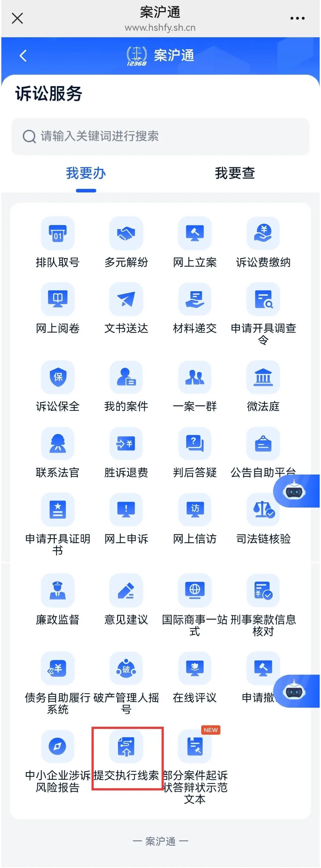 入口①:进入“案沪通”小程序,在首页【我要办】界面中找到【提交执行线索】板块,点击进入财产线索提交界面。输入案号查询并绑定执行案件,点击【申请】按钮,即可开始填写财产线索。