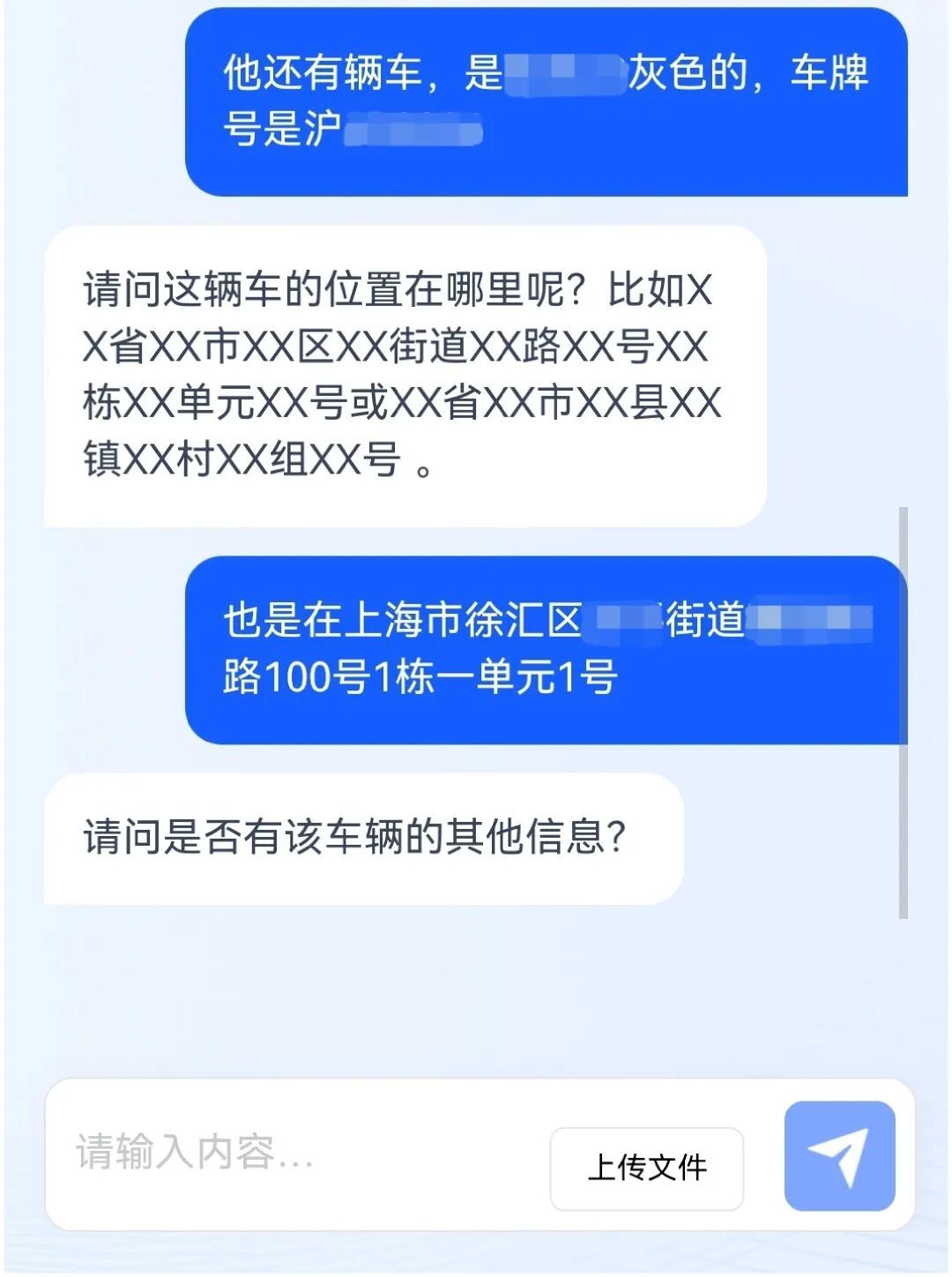 在“案沪通”首页右侧,点击机器人头像“唤醒”【案沪通AI法宝】并与之对话。告知【案沪通AI法宝】需要提交的财产线索,【案沪通AI法宝】将逐步引导线索提交人完成填写工作。