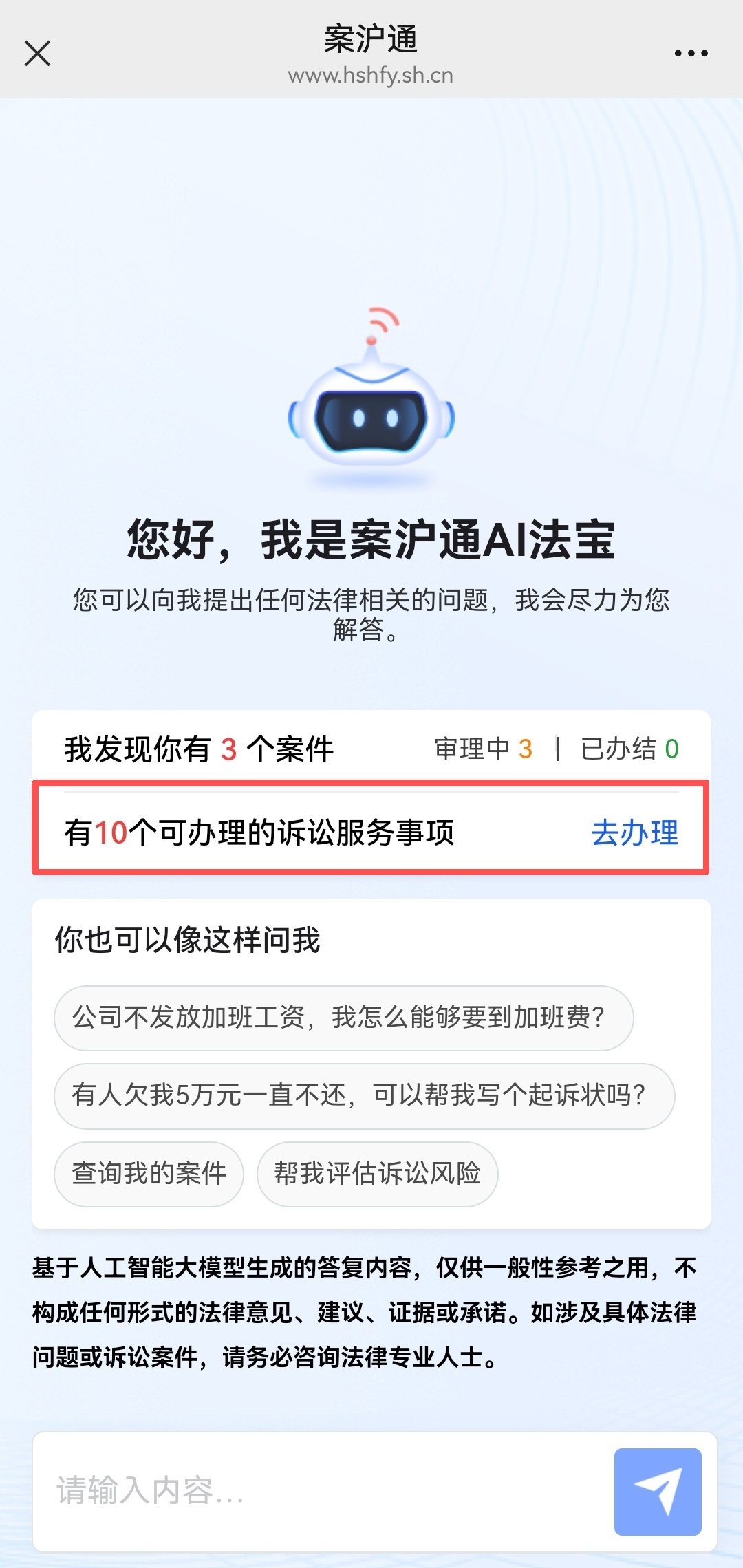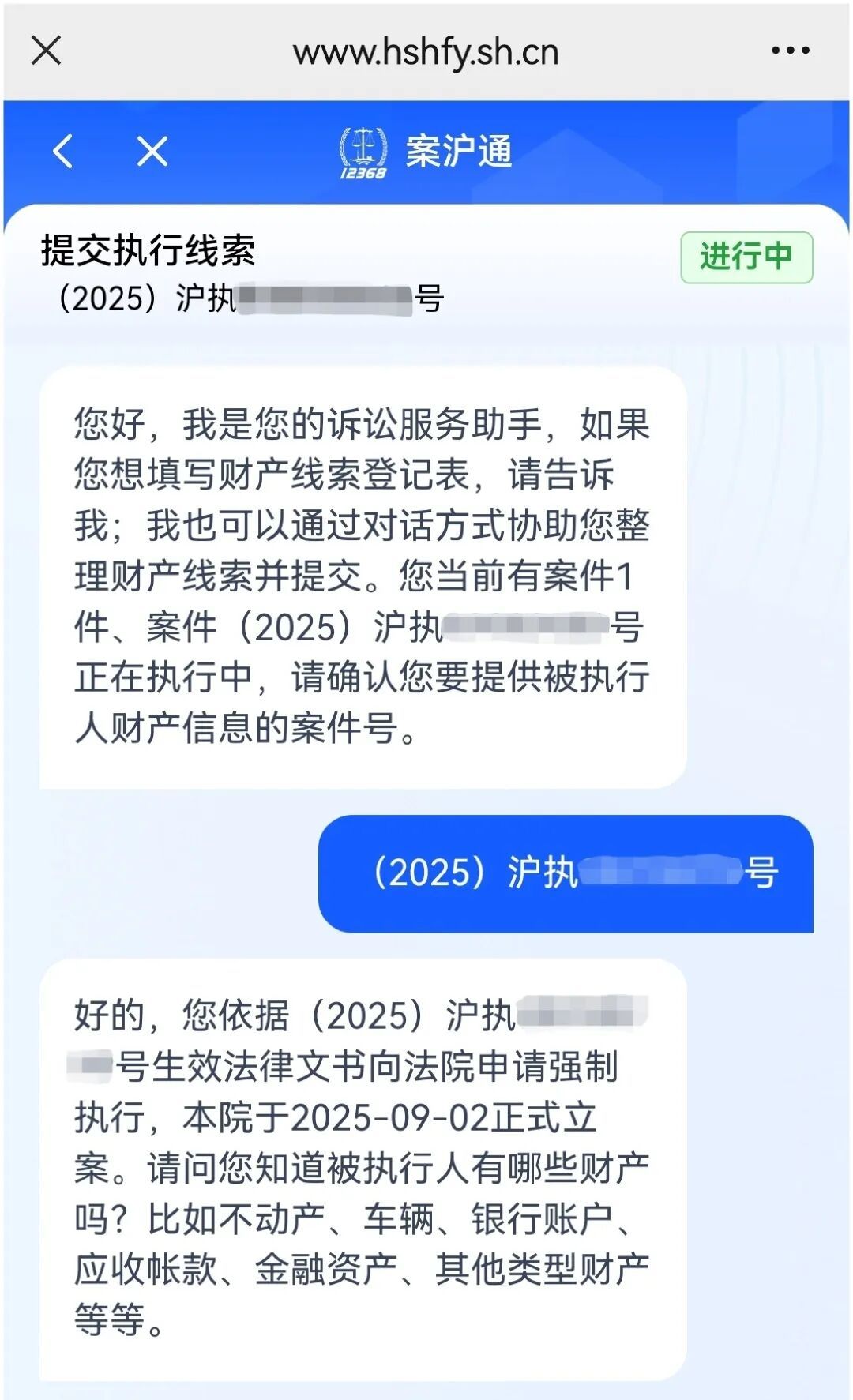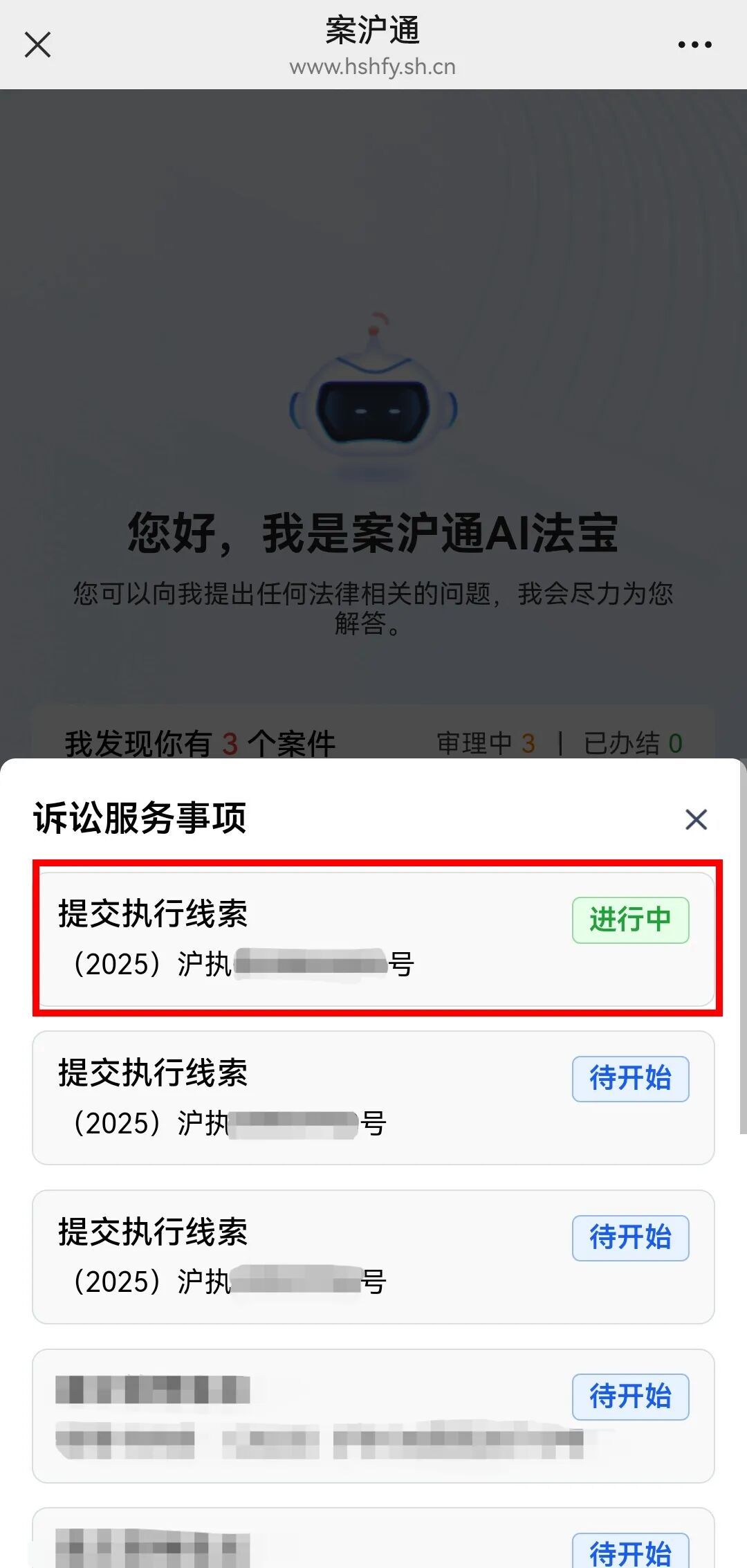 在“案沪通”首页右侧点击机器人头像“唤醒”【案沪通AI法宝】并与之对话。【案沪通AI法宝】会主动提示,存在“可以办理的诉讼服务事项”,点击右侧“去办理”按钮,找到“执行线索收集”事项,可以继续填写财产线索。