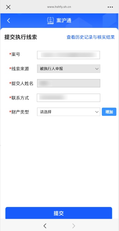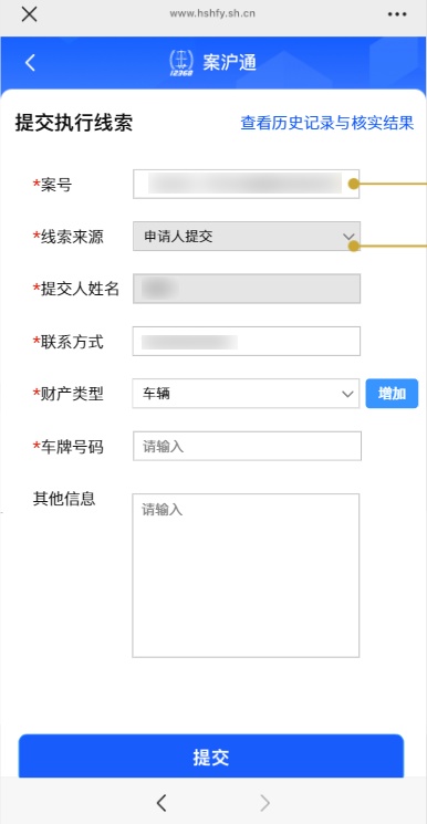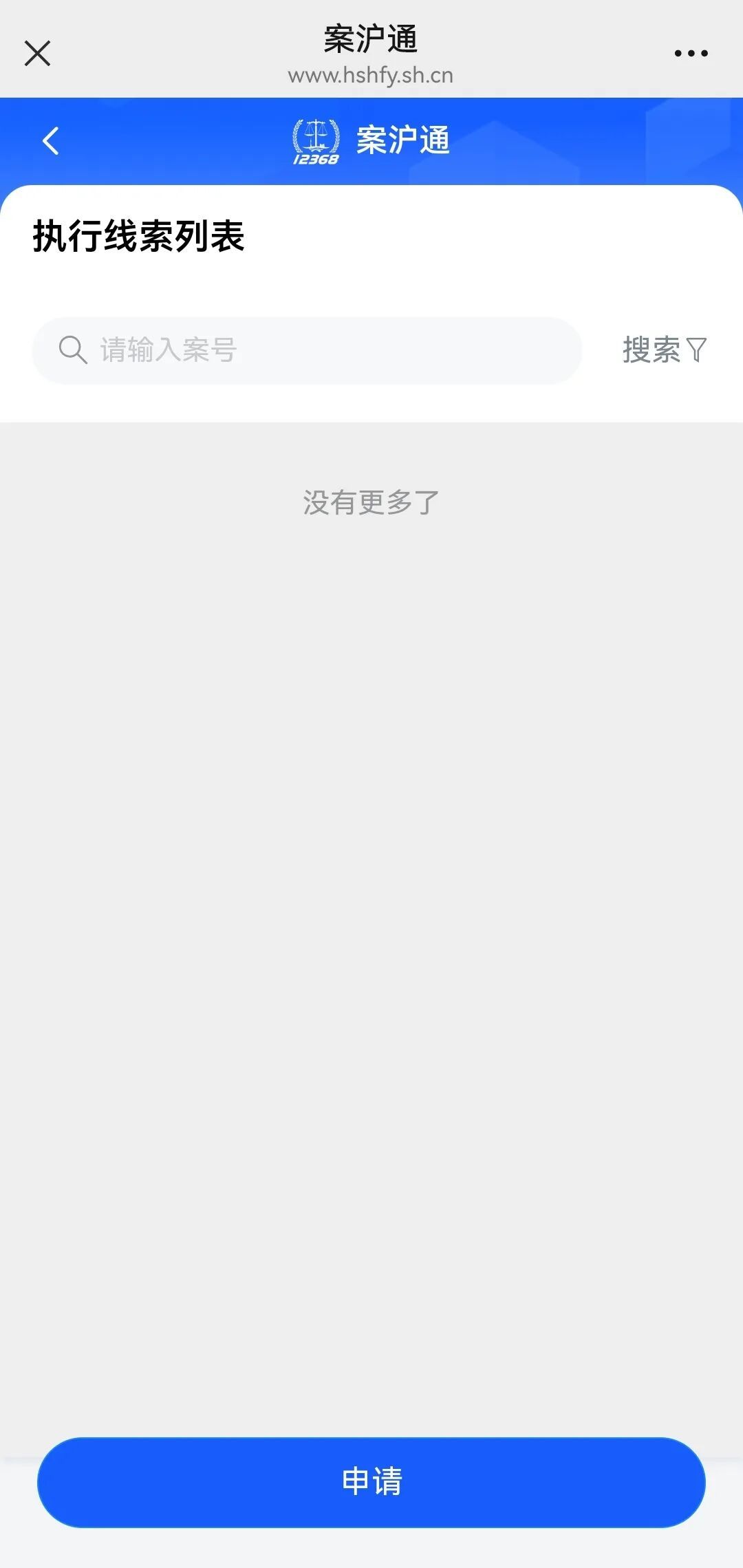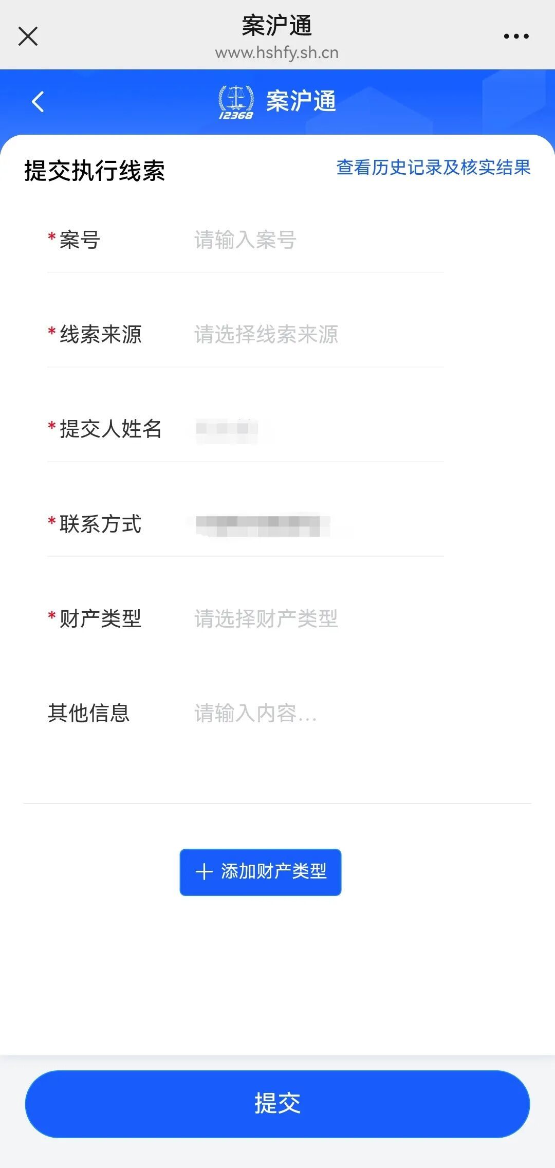 入口②:进入“案沪通”小程序,在首页【数助便民】界面中找到执行【立案告知】板块,点击进入后找到【提交执行线索】按钮,点击进入财产线索提交界面,输入案号查询并绑定执行案件,点击【申请】按钮,即可开始填写财产线索。