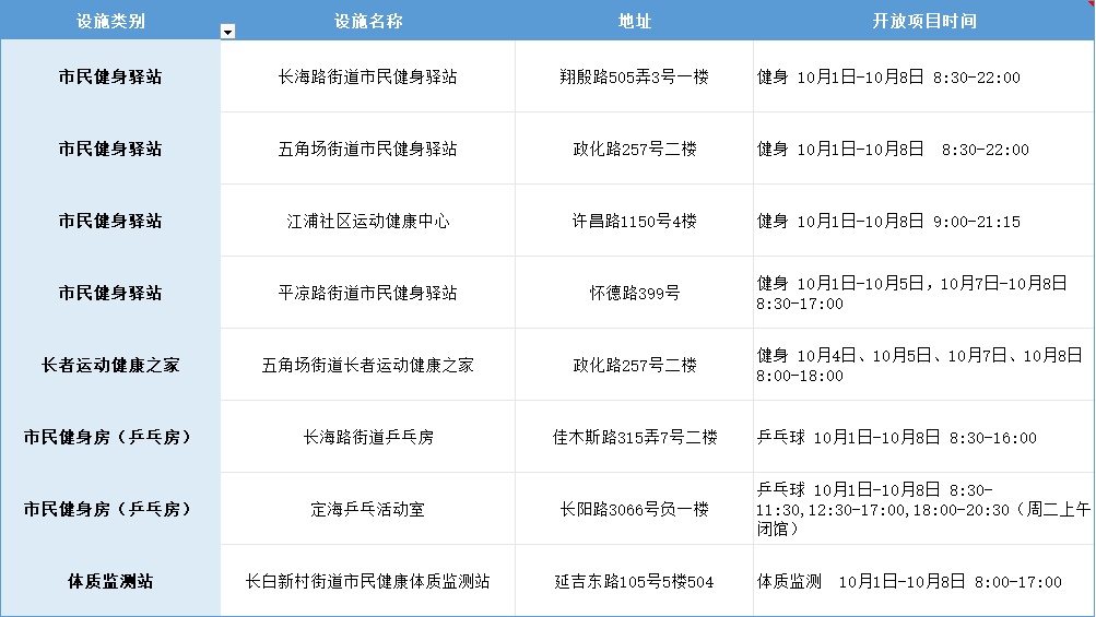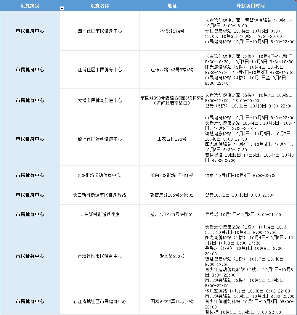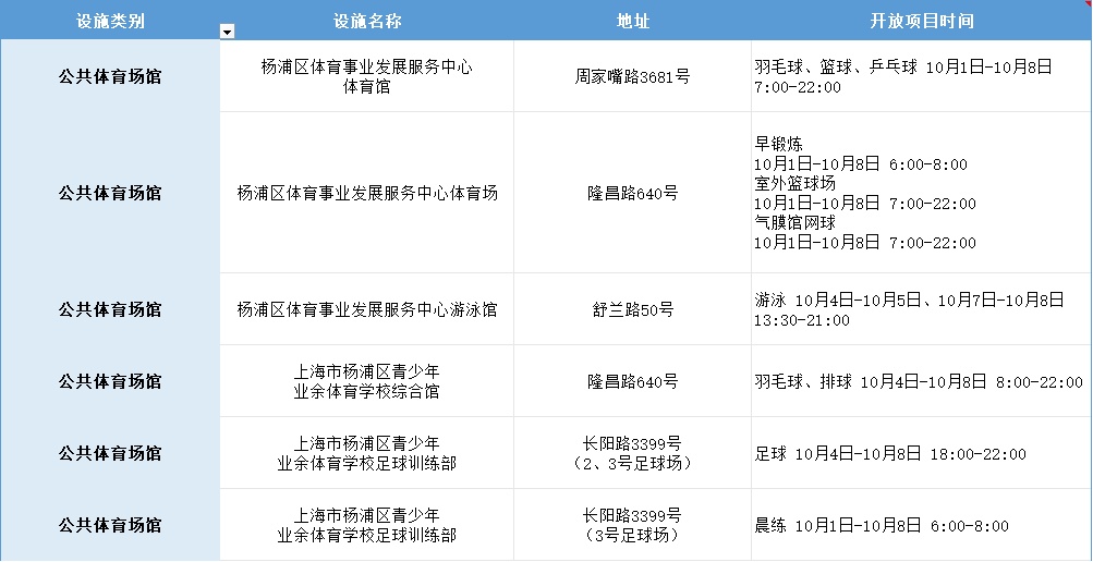 国庆假期去哪儿运动?杨浦区公共体育场馆设施开放指南来啦!特别提醒:部分热门场馆实行预约制,市民出行前请务必通过官方渠道确认开放时段和预约规则,避免跑空~(公共体育场馆)(市民健身中心)(市民球场)(其他体育场馆)为确保安全,如遇极端天气,部分设施将关闭,敬请谅解。资料 | 区体育局编辑 | 文茜婷*转载请注明来自上海杨浦官方微信(点击图片查看)