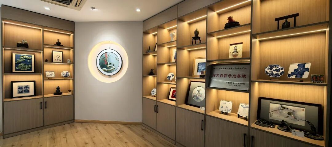 徐汇区青少年活动中心陶瓷艺术创意工坊内,近百件陶艺作品静陈于光影之间,涵盖青花、粉彩、墨彩描金等多种传统技法。有的以青花勾勒山河气象,有的借粉彩捕捉花鸟灵动,还有由师生共同创作、融合海派文化风格的现代陶艺,令人耳目一新。
