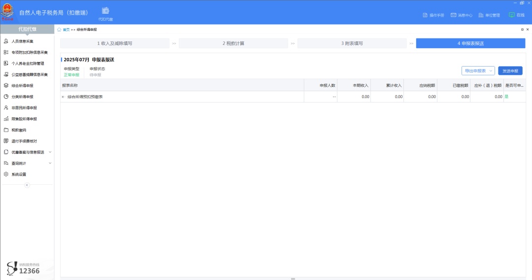 当所有信息真实填写完成后,可点击【申报表报送】,选择【发送申报】,即可完成当月的工资申报。