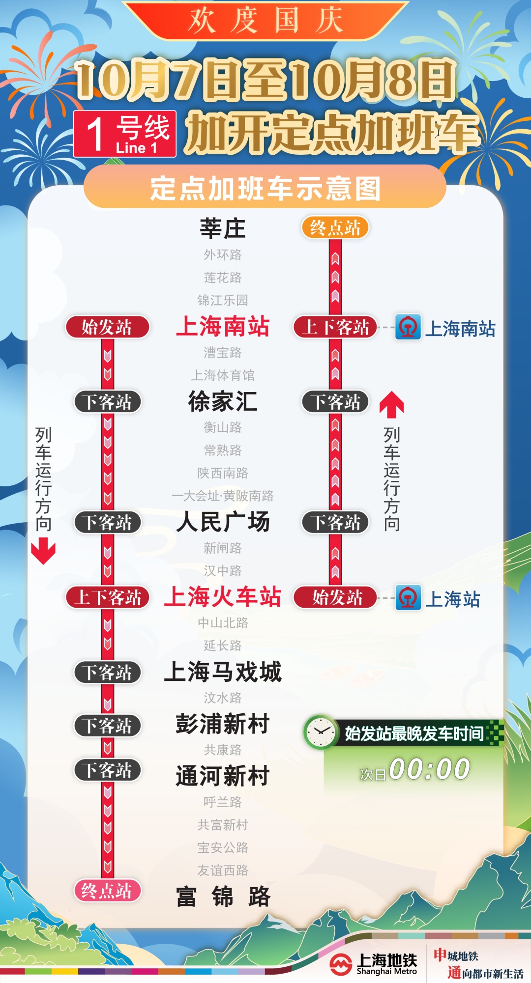 欢 度 国 庆 申通地铁集团发布国庆专项运营服务方案。其中,9月30日至10月4日,上海地铁1、7、8、9、10、13号线将实施延时运营方案,提升夜间运力;10月1日至10月6日每日16:00起,2、10号线南京东路站及14号线豫园站将临时封站,期间10号线豫园站正常运营;长假末期的10月7日至10月8日,1、2、10、17号线将加开夜间定点加班车,末班车延至次日0点,全力疏解返程大客流。详见↓ 欢 度 国 庆 提升保驾力度满足客流出行 9月30日至10月4日六线延时运营 2025年国庆中秋长假为10月1日至10月8日,共8天。上海地铁线网将受休闲娱乐、购物、旅游出行等多流叠加效应影响,届时各大交通枢纽、商圈景点等周边站点大客流压力将显著增加,据预测节前最后一个工作日9月30日当天全网客流约1140万人次,而整个长假期间客流总量约为5680万人次。此次国庆期间,上海地铁全网络将全面提升保驾等级,为运营现场“上保险”。 同时,长假期间各类大型活动集中举办,如:10月1日上海体育场亚冠精英赛、10月7日至8日国家会展中心同人展等。市内大型商圈、热门景点等休闲娱乐出行客流需求将进一步增加,夜高峰时间将有所延长。为缓解中心城区夜高峰休闲、购物客流密集的压力,最大限度满足乘客节日出行需求,9月30日~10月4日,轨道交通1、7、8、9、10、13号线将实施延时运营方案。 配合交通管制 10月1日至10月6日每日16:00起 2、10号线南京东路站 及14号线豫园站封站 根据交通管制工作方案,10月1日至10月6日,每日16:00至运营结束,地铁2、10号线南京东路站,14号线豫园站计划实施封站。封站时段内在2、10号线南京东路站,14号线豫园站不能上下车,地铁站出入口也将关闭,乘客不能进出车站。届时,车站将加强站内广播宣传、导向设置、站台站厅秩序维护等工作。同时,上海地铁网络其他涉及地面交通管制区域的重点大客流车站,如人民广场站、陆家嘴站、10号线豫园站等站点,也将与地面交通组织配合,视客流聚集情况和站外地面实际情况进行限流、分流等客运组织措施,以确保乘客安全。需要提醒乘客的是:14号线豫园站临时封站期间,10号线豫园站仍正常运营,此外2、10号线南京东路站,14号线豫园站的临时封站时间或将根据相关部门要求有所调整,届时请配合车站工作人员指引。 10月7日至10月8日 1、2、10、17号线加开定点加班车 为提升国庆返程期间重要交通枢纽夜间疏散能力,根据计划,10月7日至10月8日,地铁1、2、10、17号线也将加开定点加班车,末班车发车时间延长至次日0点。同时,地铁运营方还将密切关注虹桥枢纽夜间客流情况,根据现场客流需求或将进一步延长定点加班车开行时间。 预计本次假日期间,南京路步行街及外滩周边商圈、景点游客将明显增多。南京东路站、人民广场站、陆家嘴站、豫园站及天潼路站等站点客流或大幅增加。此外,本市各区域各类赛事、活动密集举办,毗邻站点或将面临大客流压力。如客流集中,或出现瞬间大客流情况,部分站点会根据现场客流实际情况,采取相应限流措施,请乘客理解支持,届时听从现场工作人员指引,有序进出车站。
