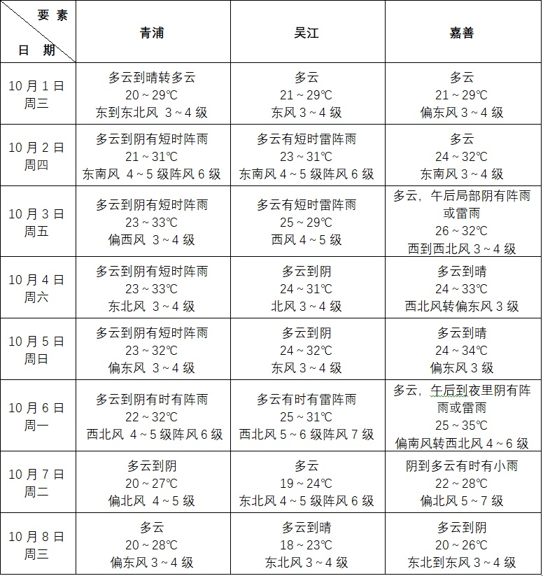 假日期间青浦区以多云天气为主,10月2-5日局地有弱降水、10月6日阴有时有阵雨。假日期间气温先升后降,极端最高气温32~33℃出现在10月3-6日,10月6日后期冷空气扩散南下,7日起气温回落。