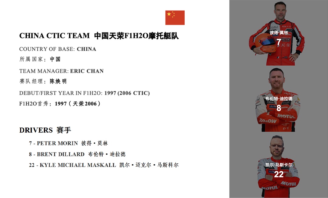 2014-2016赛季三连冠得主——中国天荣F1H2O摩托艇队强势回归主场!主力赛手彼得·莫林向领奖台发起强有力的冲击!经验丰富的凯尔·马斯科尔将首次代表中国天荣F1H2O摩托艇队亮相,表现值得期待。