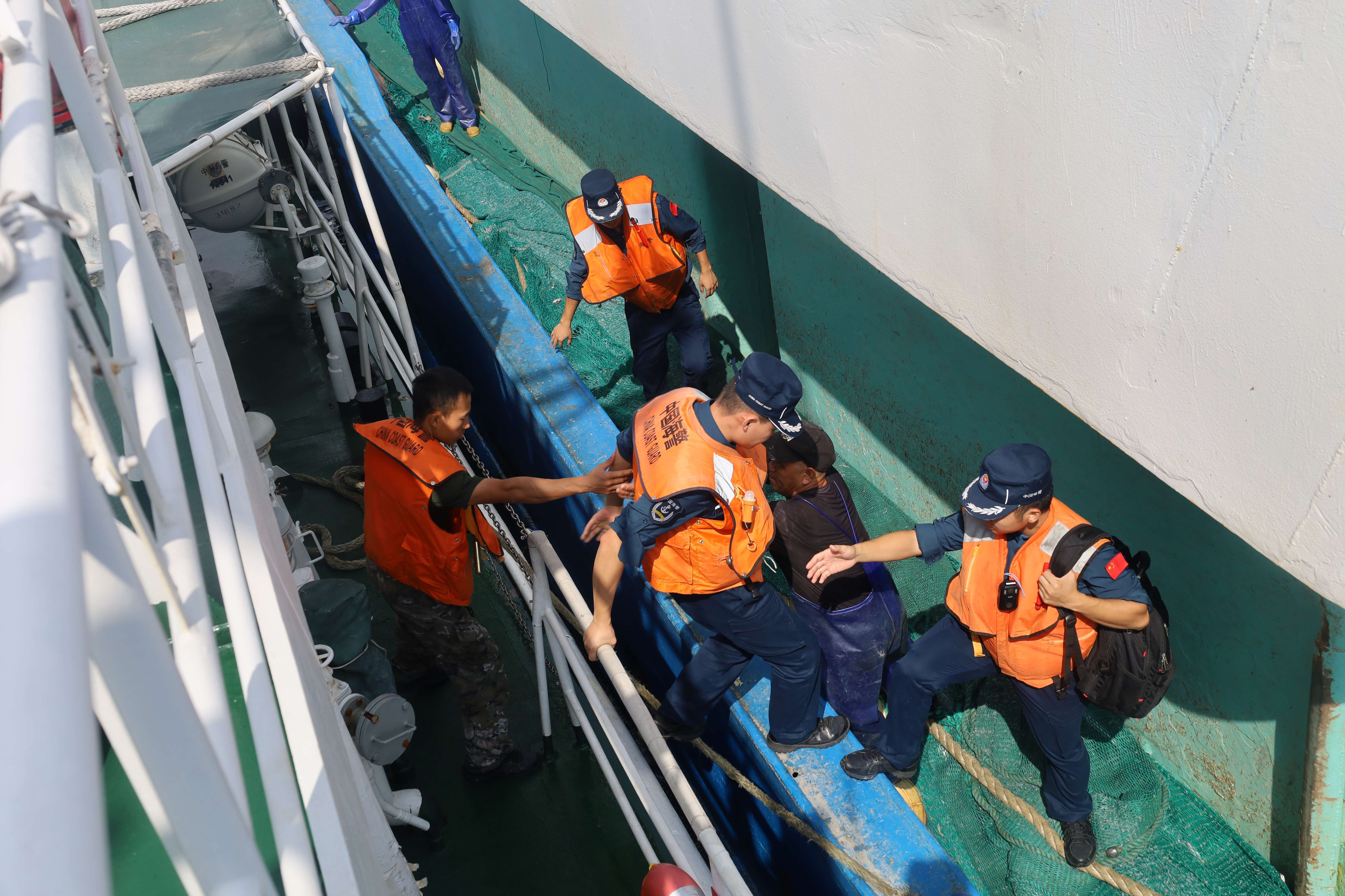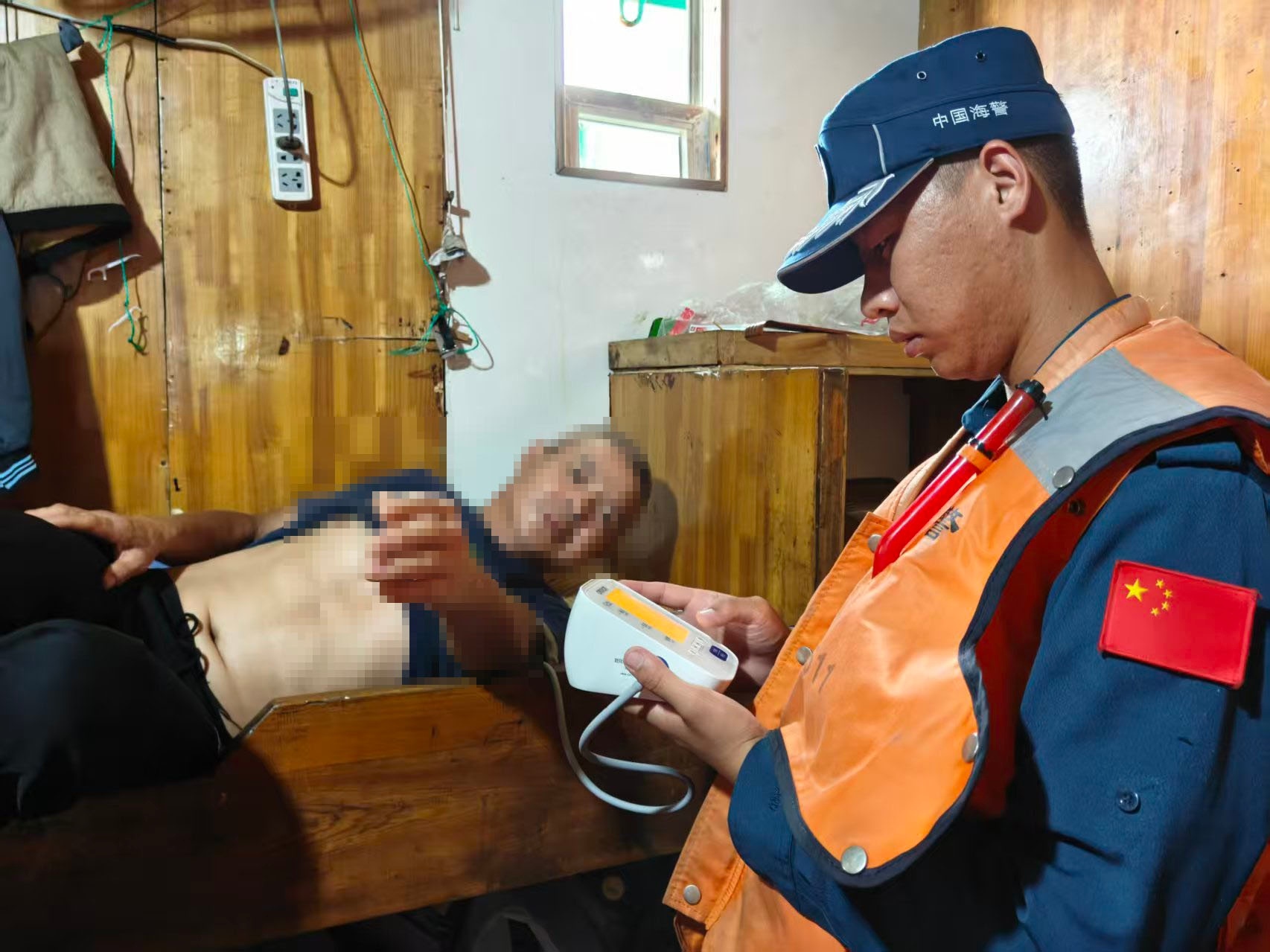9月29日,正值国庆前夕,上海金山海警局执法艇在辖区内对渔船开展日常登临检查时,发现该船一渔民因海上起网作业时不慎被缆绳误伤胸口,导致呼吸不顺,无法饮食,情况十分危急。执法员迅速安排卫生员携带血压计、应急药品登船。