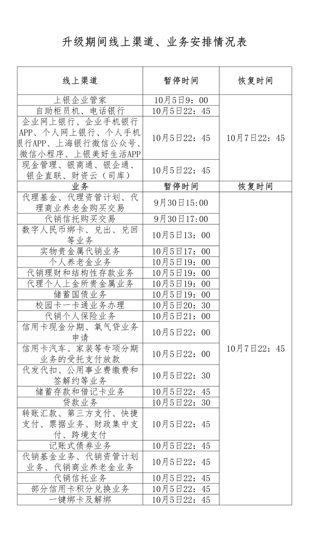 答:为确保我行核心系统顺利升级,9月27日至10月7日22:45暂停我行门户网站、上行惠相伴公众号和小程序、上海银行公司金融公众号等渠道预填单业务;暂停一窗通开户、账户变更或销户预约业务。