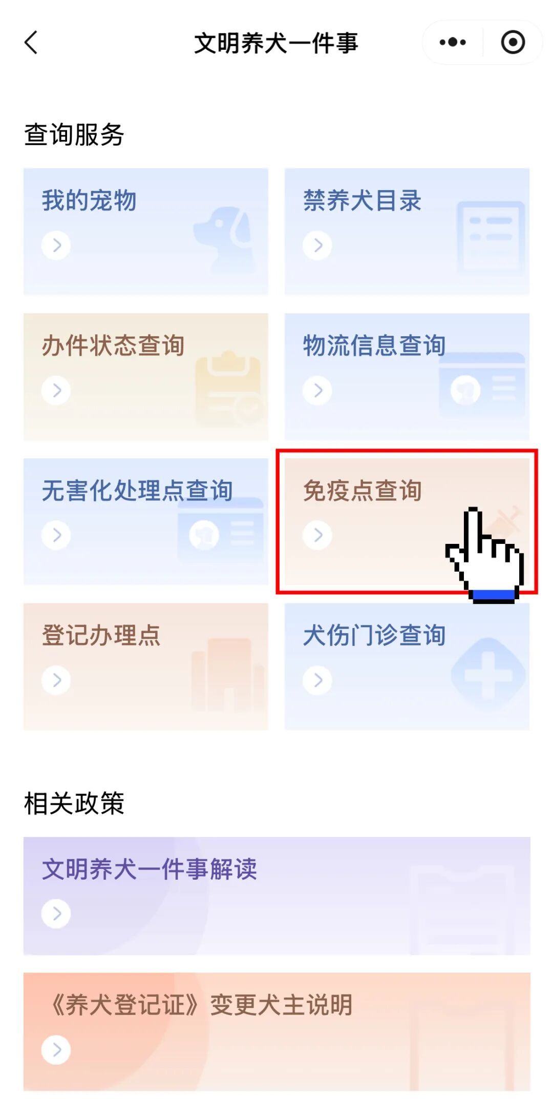 在“文明养犬一件事”专栏,点击进入“办事大厅”,选择查询服务——“免疫点查询”,即可查询到您所在区域内,官方认证的宠物疫苗接种服务点。