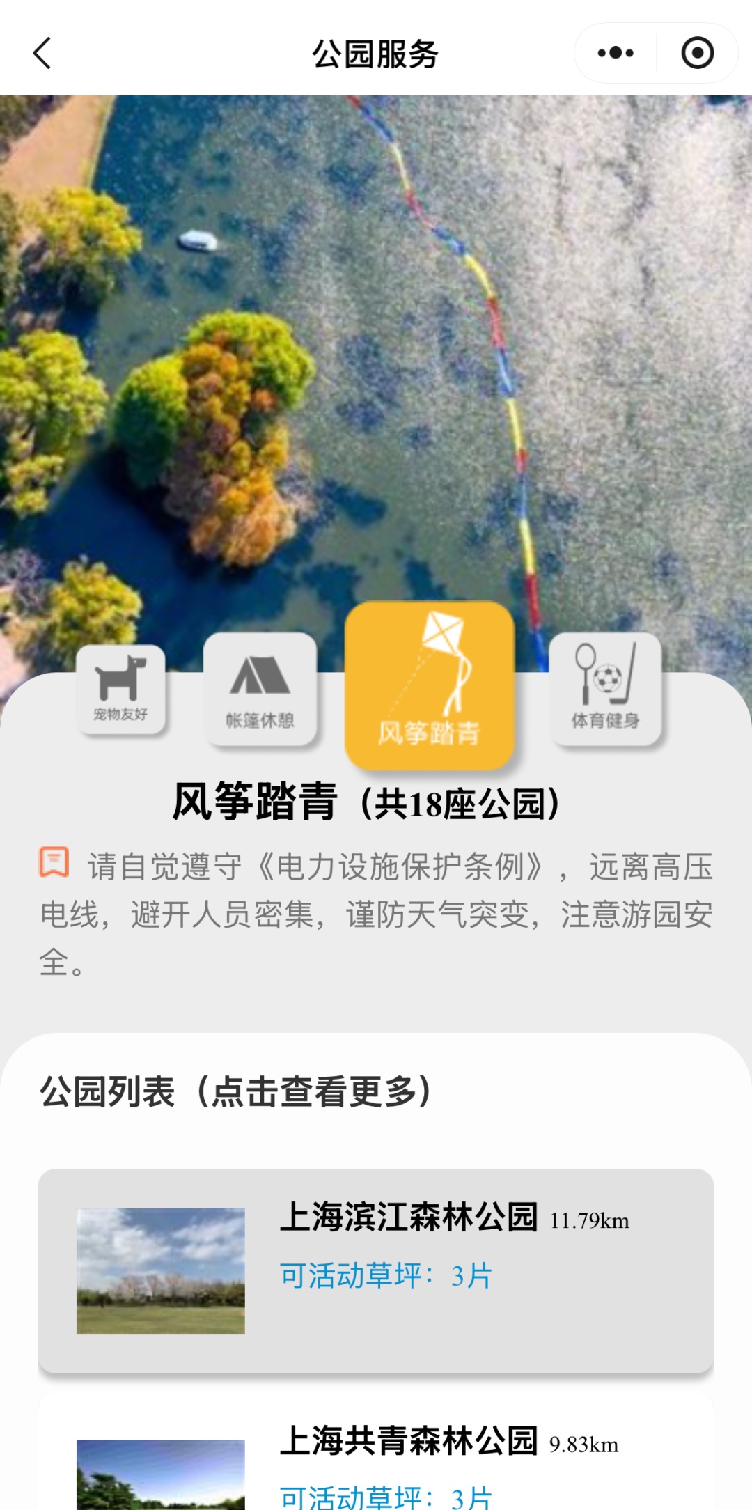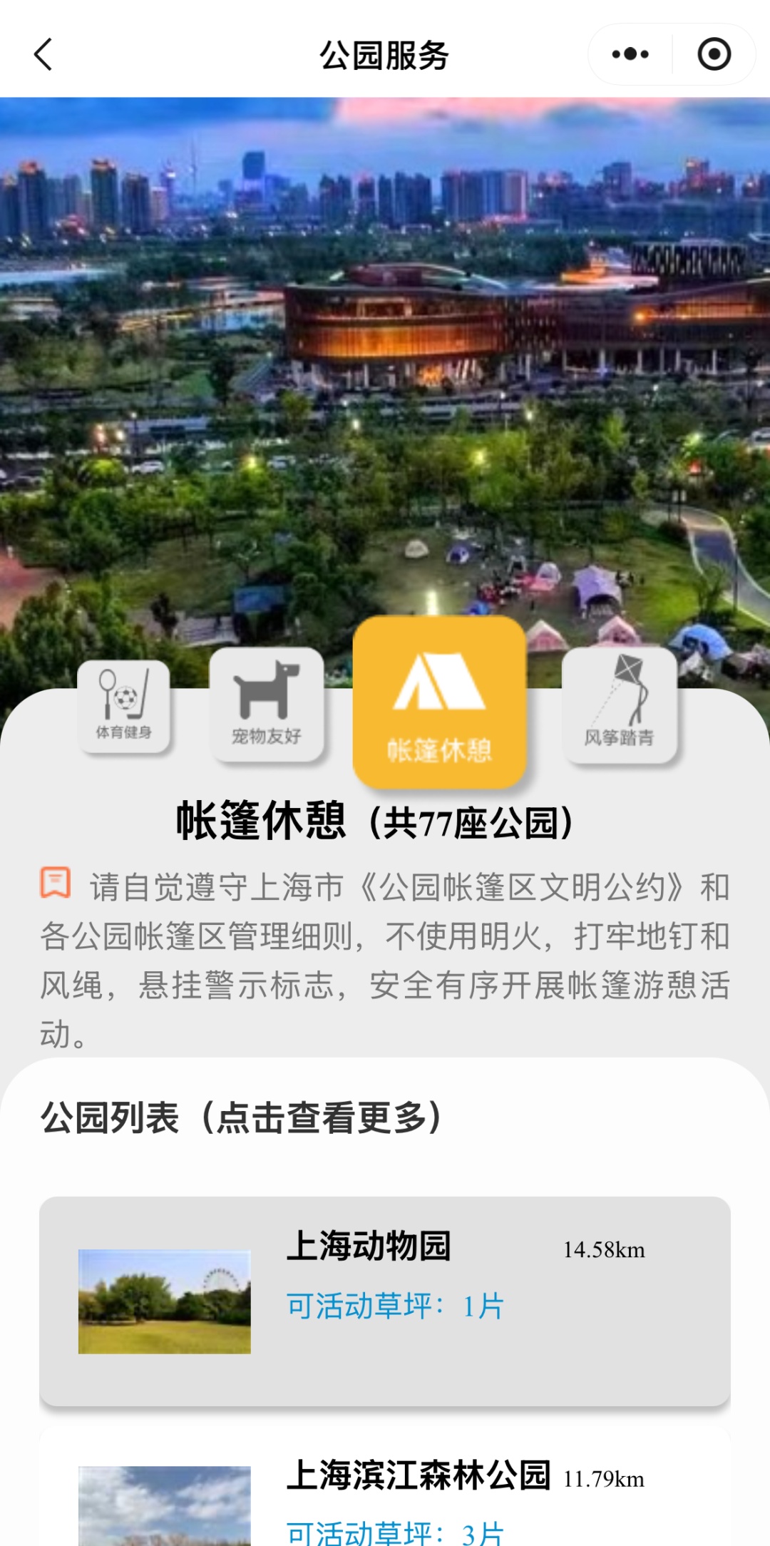 大家还可以根据游玩需求,选择具有「帐篷休憩」、「风筝踏青」、「体育健身」等功能的公园。