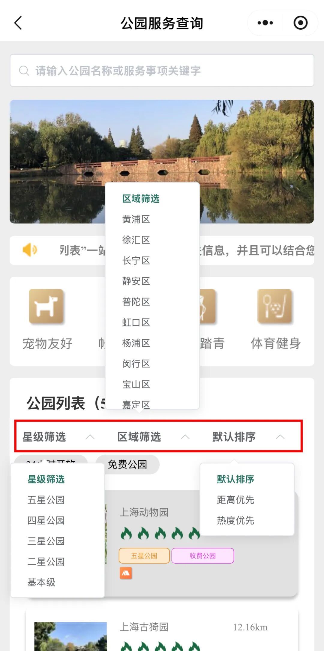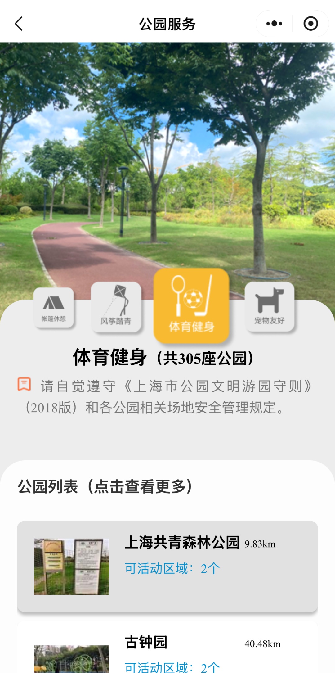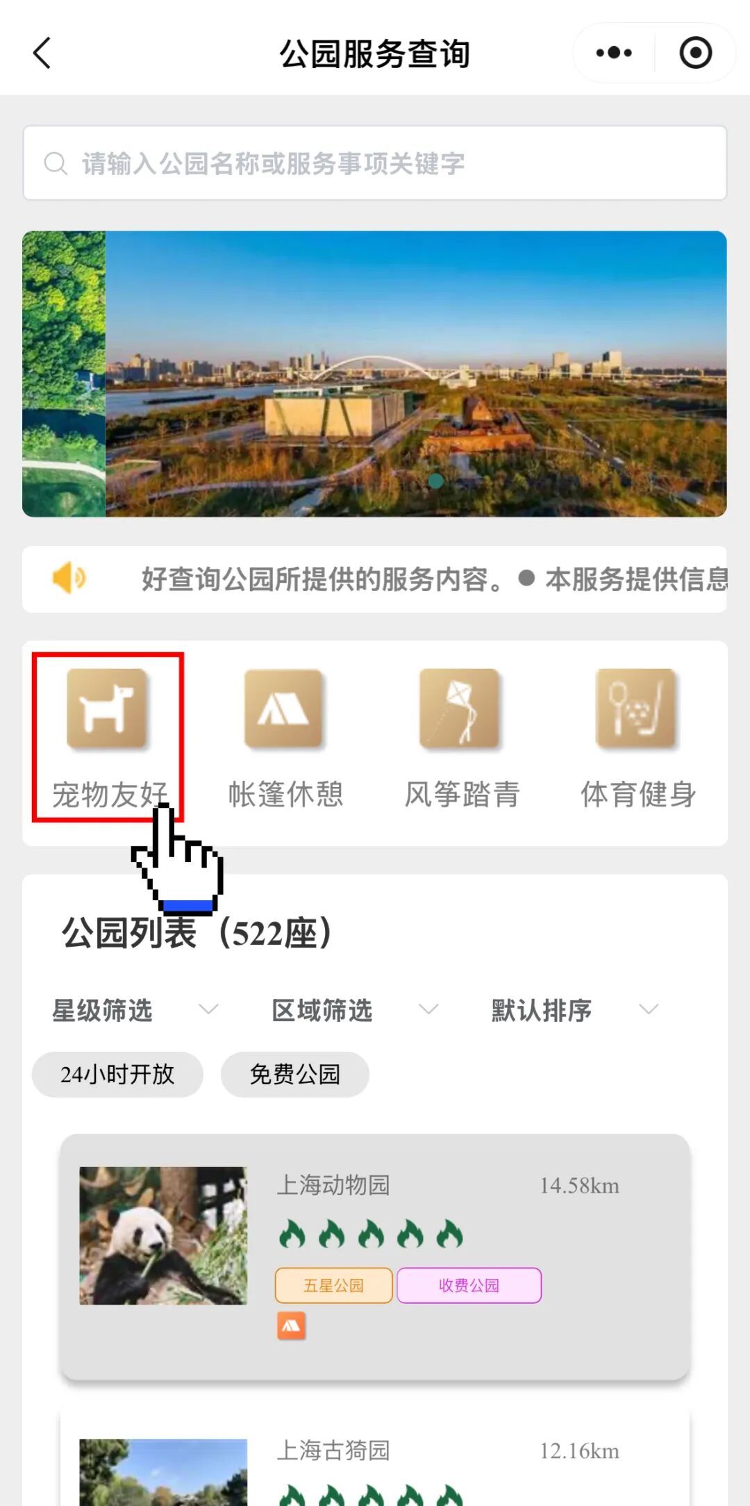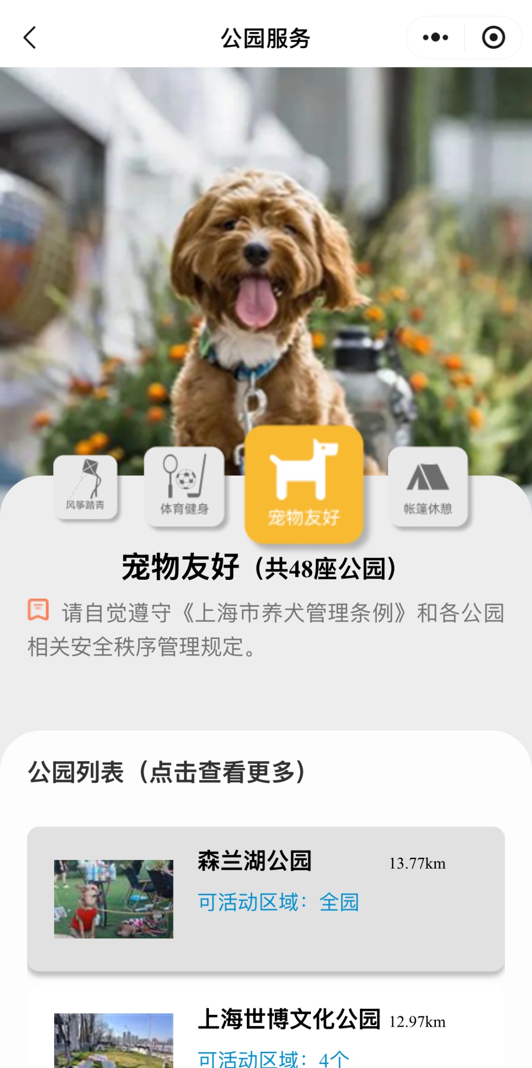 服务还按功能对公园进行划分,计划携宠出游的朋友们直接点击进入「宠物友好」,即可一键查询全市符合条件的公园信息。
