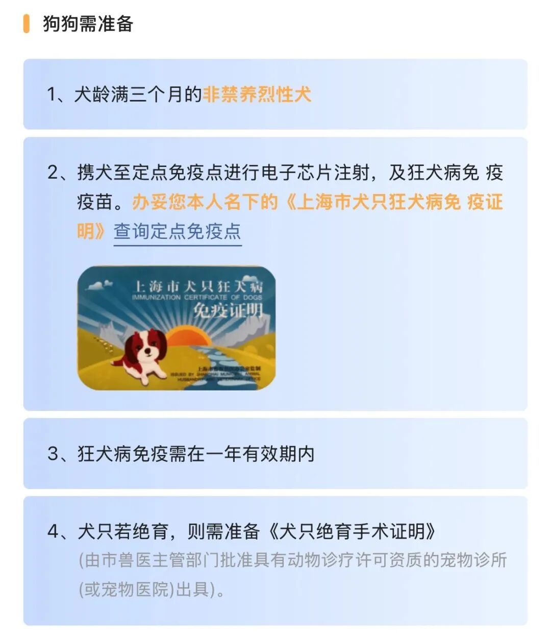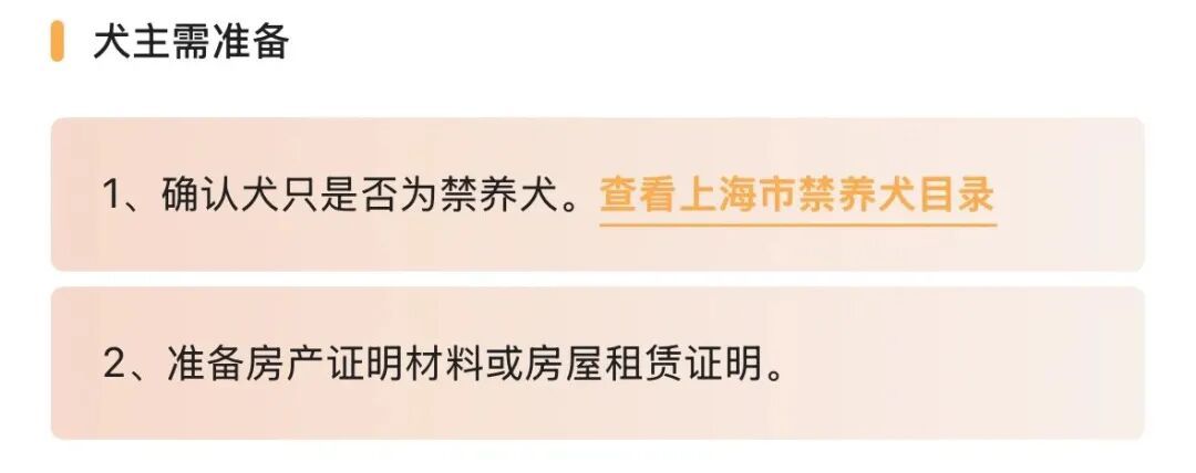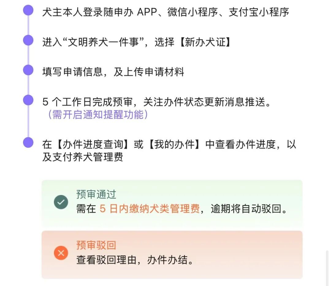 温馨提示:携带爱犬外出时,请务必提前办理犬证!可在“随申办市民云”文明养犬‘一件事’在线申请,直接快递到家!专区内还有年检、地址变更、补证等多项服务,轻松实现一站式办理!
