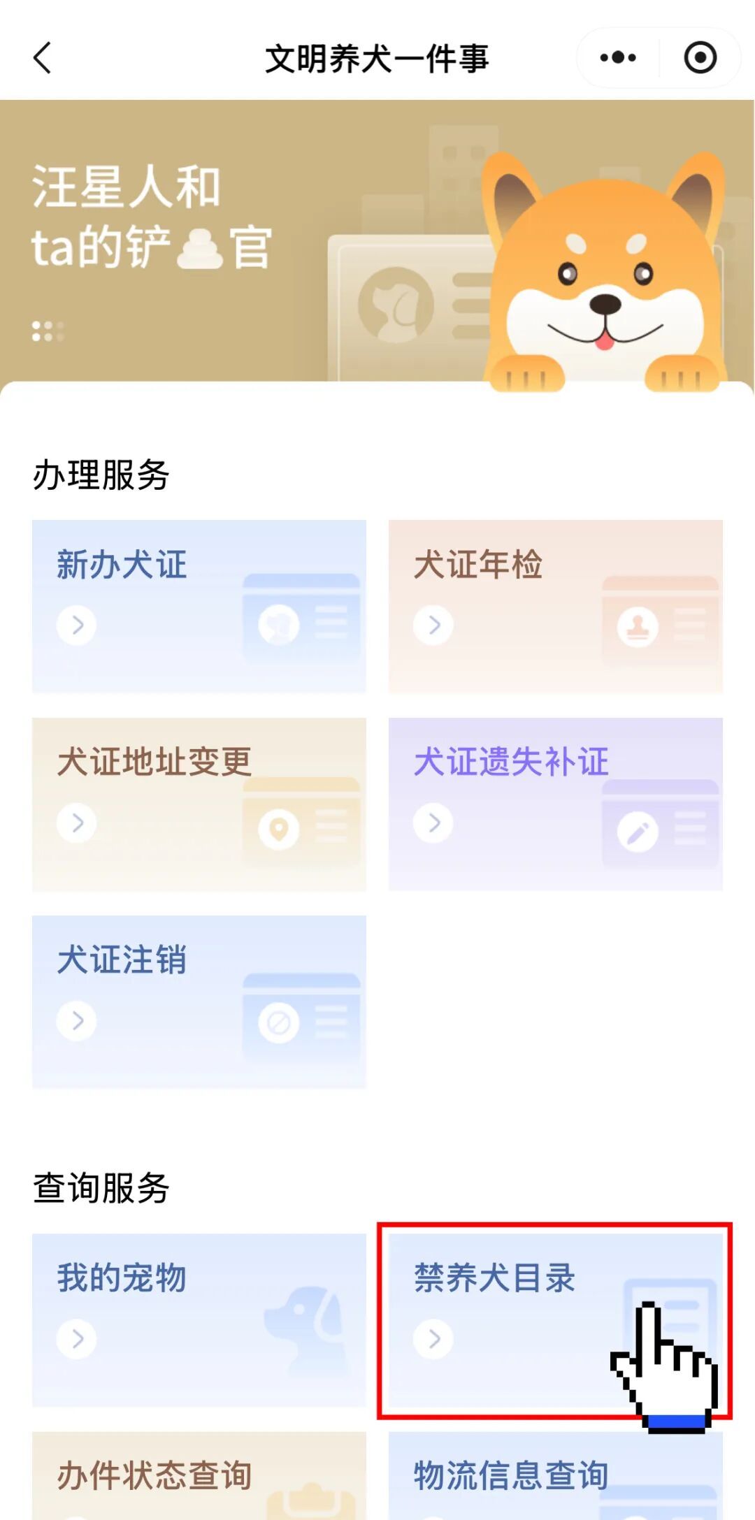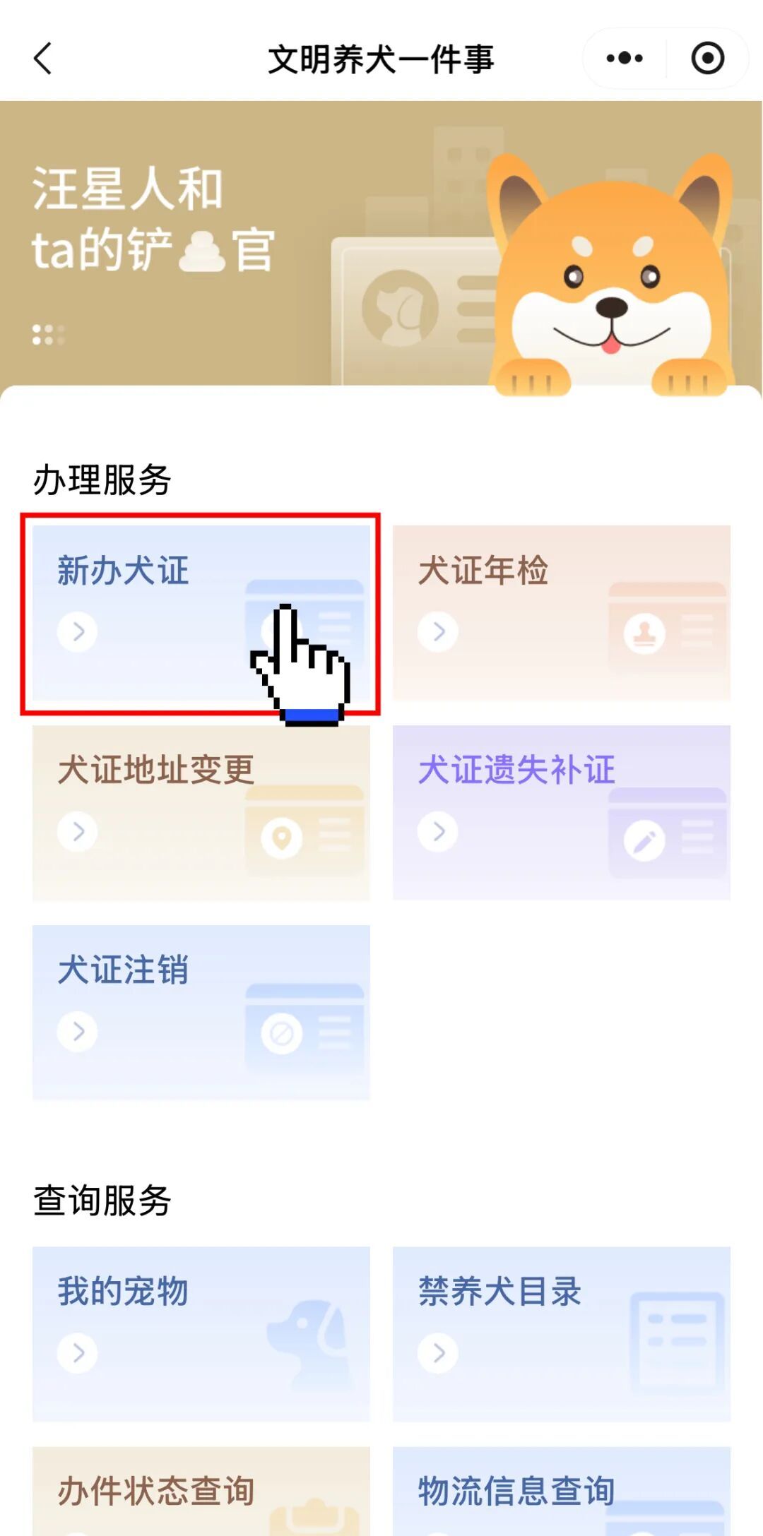 在“文明养犬一件事”专栏,点击进入“办事大厅”,选择办理服务——“新办犬证”。
