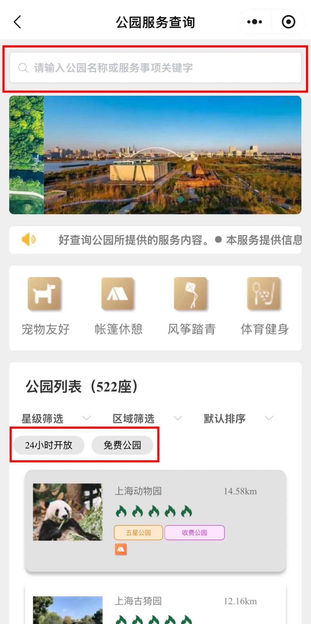 服务整合了全市522座城市公园信息,方便市民随时随地查询了解、获取公园位置、开放时间、公园历史、景观特色等信息,大家还可以根据区域、星级、24小时开放、免费公园等标签快速筛选查找心仪的公园。