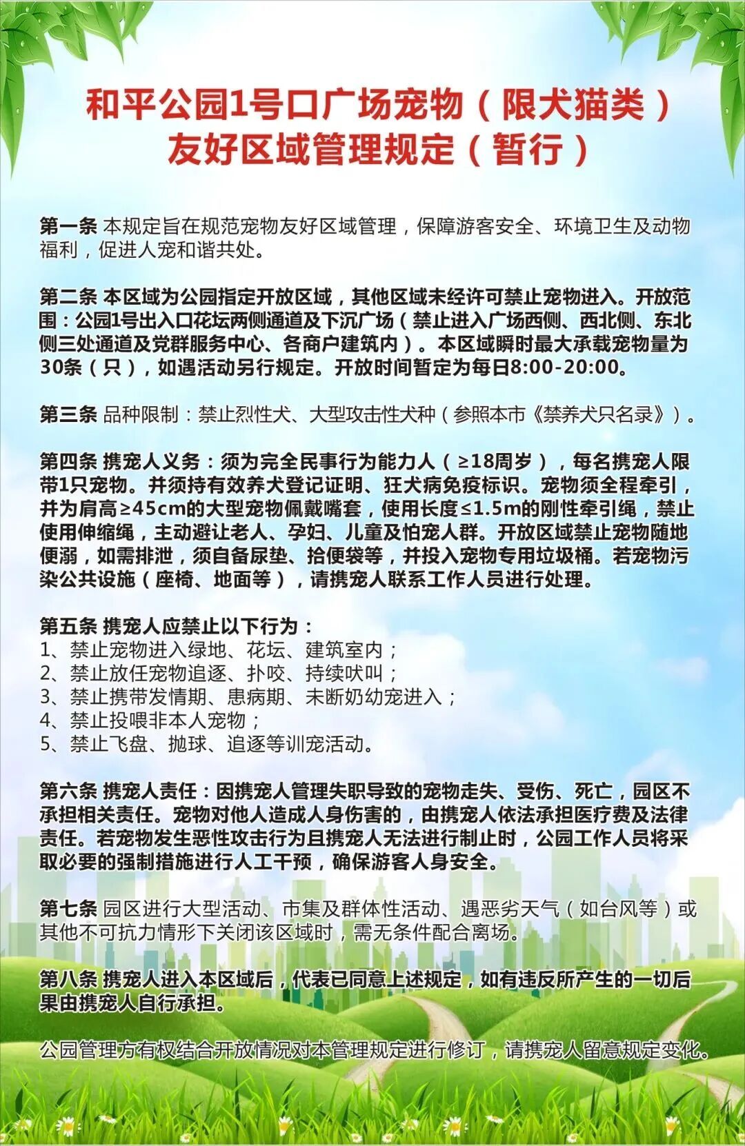 目前,和平公园1号口下沉式广场的开放时间暂定为每日8:00-20:00。园方要求携宠人须年满18周岁,宠物须全程牵引。详细信息请关注和平公园1号口的告示牌。