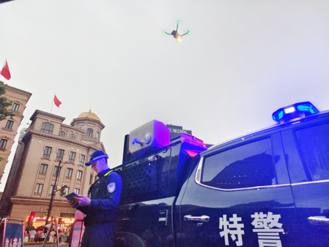 在外滩滨江,警用无人机搭载视频与广播系统,一方面实时管理区域空域情况,另一方面循环播报合规飞行要求。精准宣传是杜绝违规的另一重要举措。警方协调相关部门探索对接通信运营商,向景区市民游客推送定制化短信,内容涵盖管制区域范围、“随申办”报备步骤、“黑飞”警示案例等实用信息。同时,警方推动建立多方协同监管机制。外滩治安派出所组织重点楼宇、企事业单位及物业负责人召开“无人机管控联防会”,明确各方在违规飞行劝阻、突发事件处置中的职责。