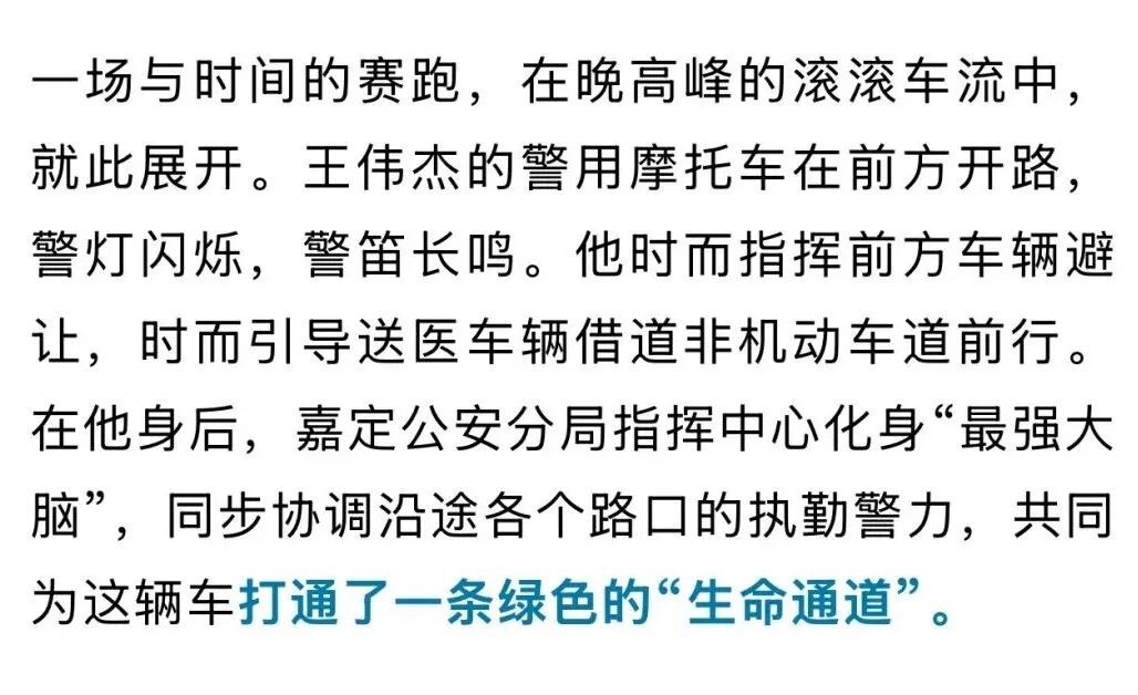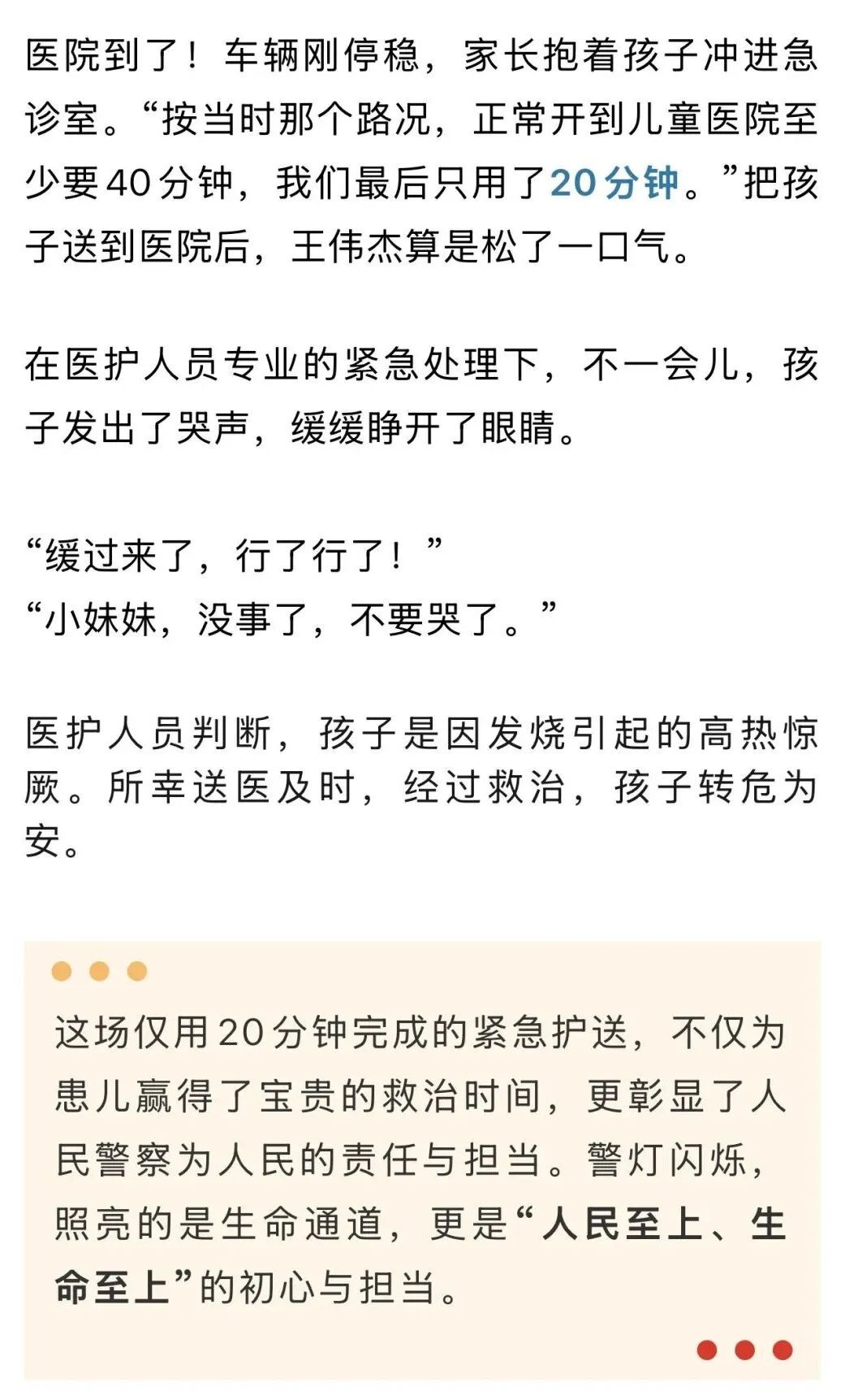 执勤的嘉定交管支队四大队民警王伟杰,一个箭步冲到车边,看见车后排的孩子正被家长紧紧抱在怀里,不省人事。“我去开摩托车,你等下跟我后边!”见此情景,王伟杰立即发动警用摩托并上报指挥中心。